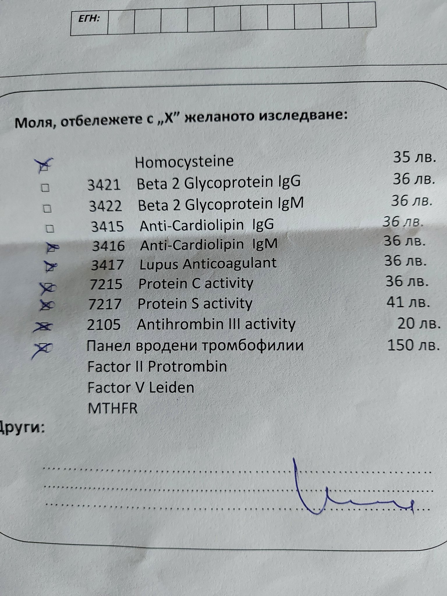 Може да си пуснете изследването за тромбофилии в националния център в Майчин дом. Цената е по-ниска там и лекар ми каза, че всички клиники до скоро са си пращали пробите към него. Най в час са.