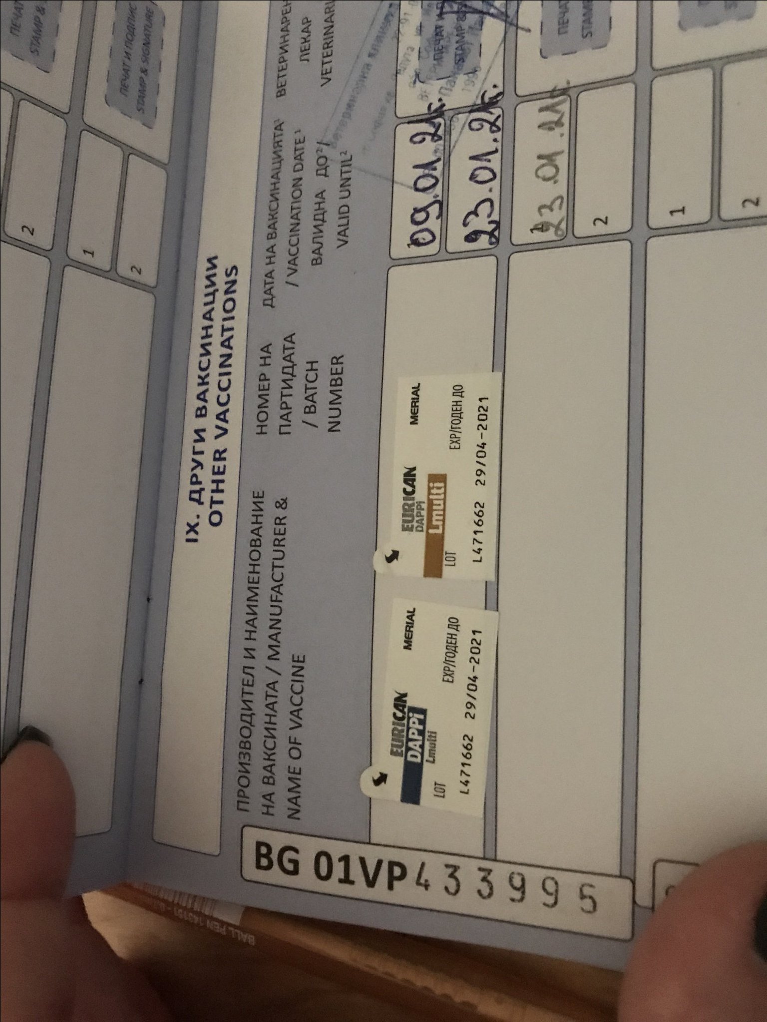 Прилагам снимка по-долу на чисто новия й паспорт с ваксини, казаха ни да отидем пак на 23.01 за ваксина за бяс+реваксинация... Бяха много натоварени в клиниката и не ми дадоха повече детайли защо процедират така. Ако някой от вас е по-информиран по темата с ваксините би ли споделил мнение, моля..
