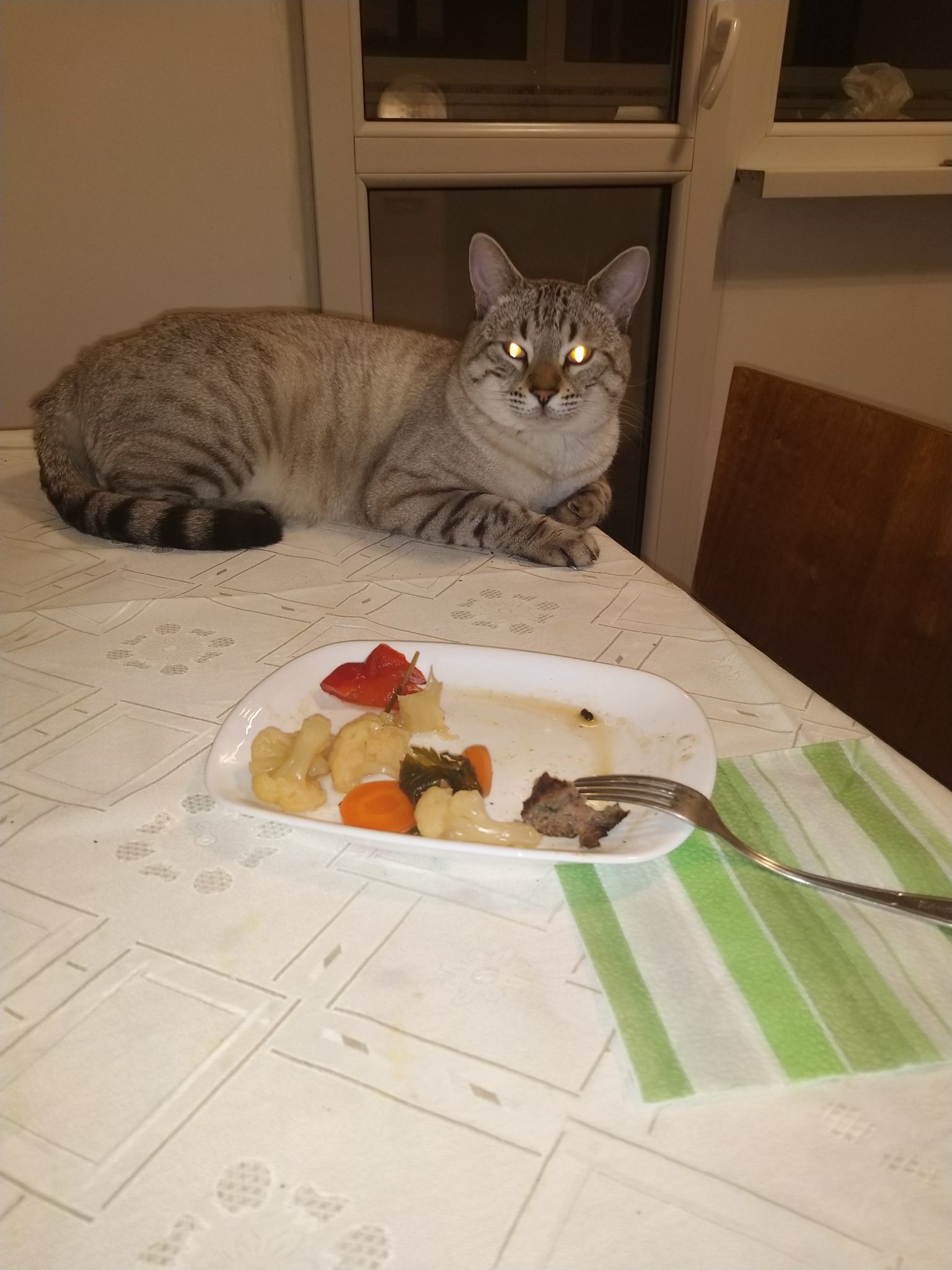 Сутрин и вечер моите си чакат паучовете и консервите. Суха храна винаги има заредена в две купички, по средата е водата. Посреднощ явно хрупат здраво, защото сутринта са празни. А от неизядените паучове, намазват кокошките. Те са пернати прасенца, които ядат всичко. Прозореца на кухнята е точно над тяхното дворче и само да засекат движение, се нареждат и чакат 🤣