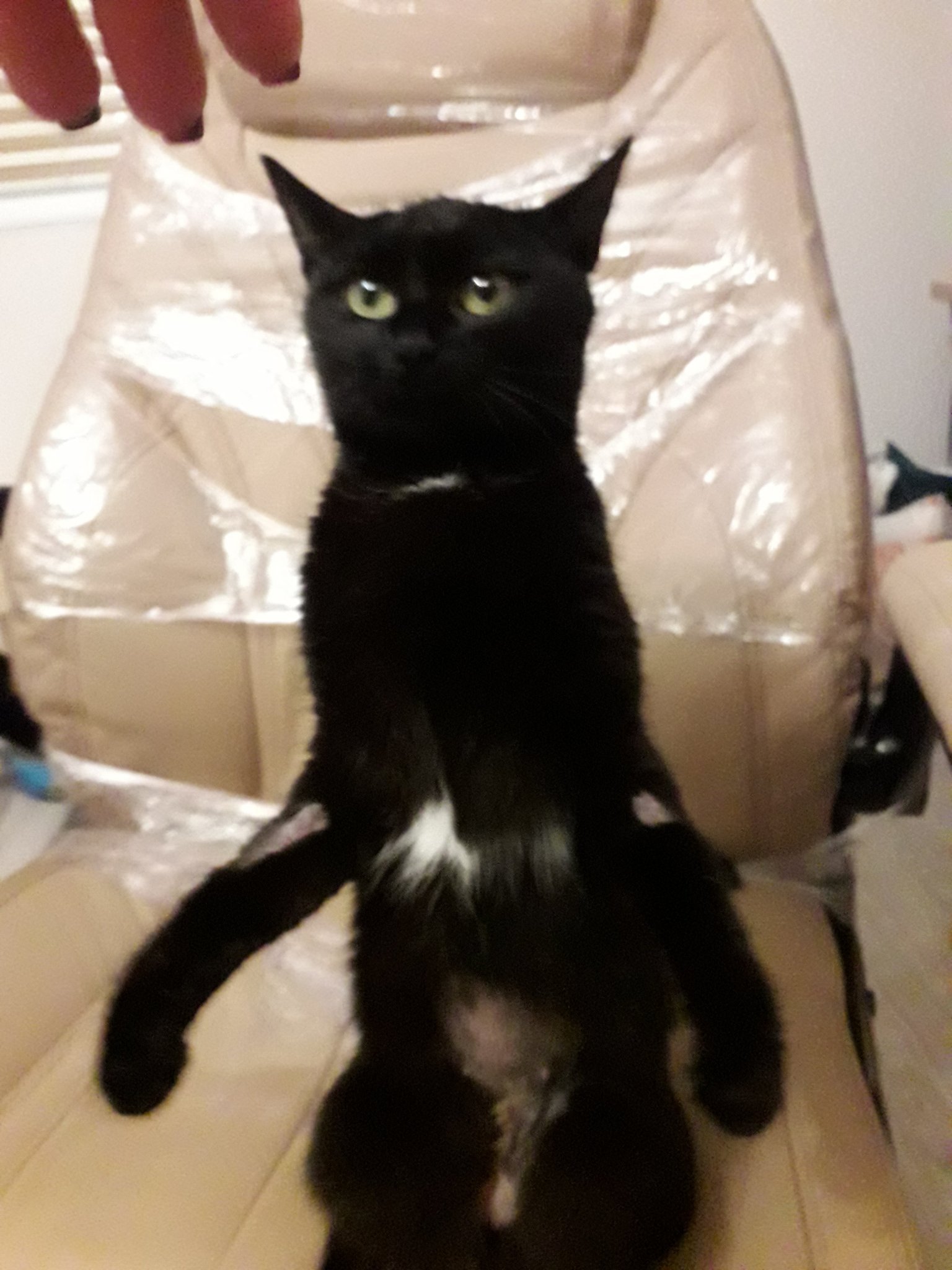 Рая днес вече съвсем по-добре изглежда, вече няма температура, спря да дърпа конците (но за сметка на това облизва мазилото Unamused) и се храни с апетит, вече втори пауч за деня, закача се, иска да играе. От клиниката казаха да отидем другата неделя за сваляне на конци.