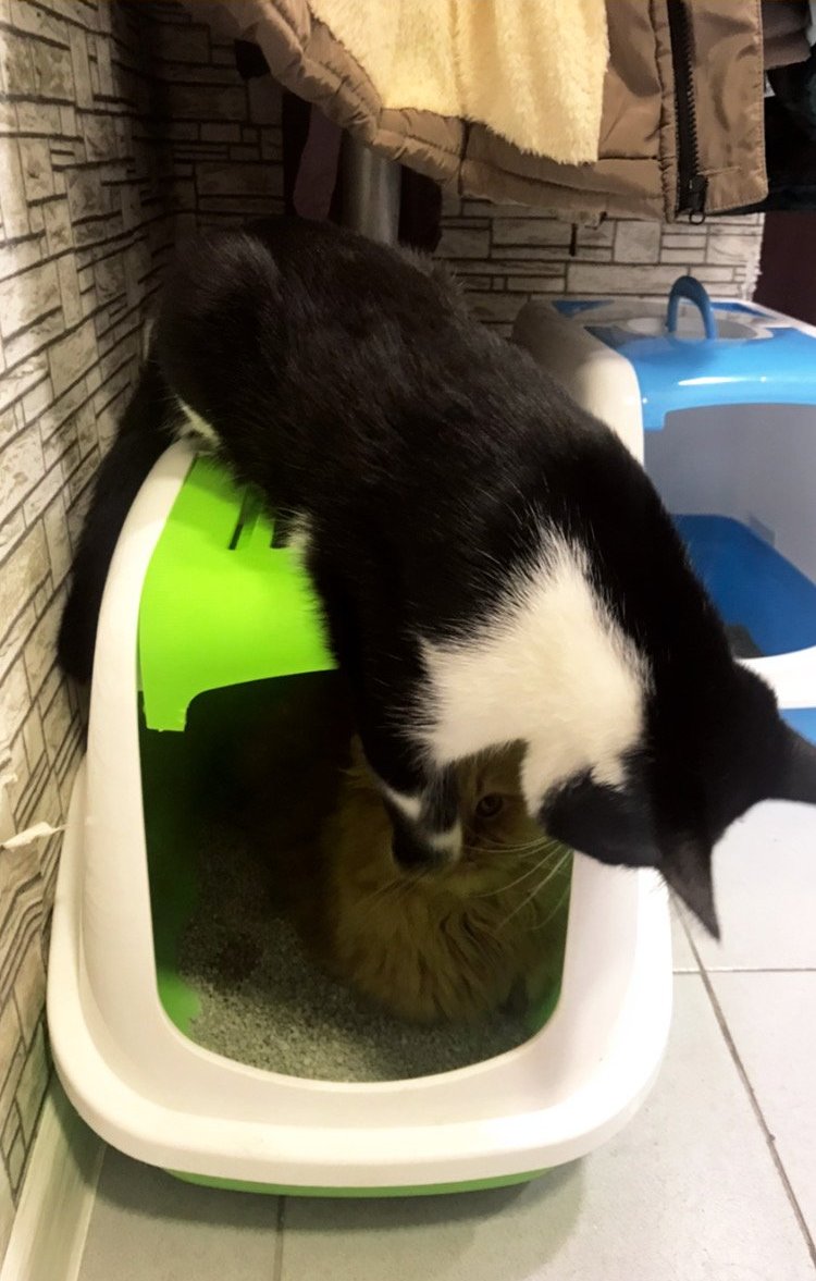 Той е момче на около 8 месеца. Кастриран, много любопитен и гальовен... Но... от скоро (може би 1-2 месеца) имаме проблем с тоалетната.  По-конкретно с прицелването. Когато пишка всичко е наред. Влиза си в тоалетната, сяда, действа и прилежно си заравя. Но когато трябва да свърши голямата нужда често се случва "материалът" да е извън толетната... Влиза вътре, рови доста по-интензивно и продължително, върти се и накрая застава приклекнал така че дупето му е над ръба на тоалетната и... резултатът можете да си го представите (имам снимки, но освен ако не мислите че биха били от полза, смятам да ви ги спестя).