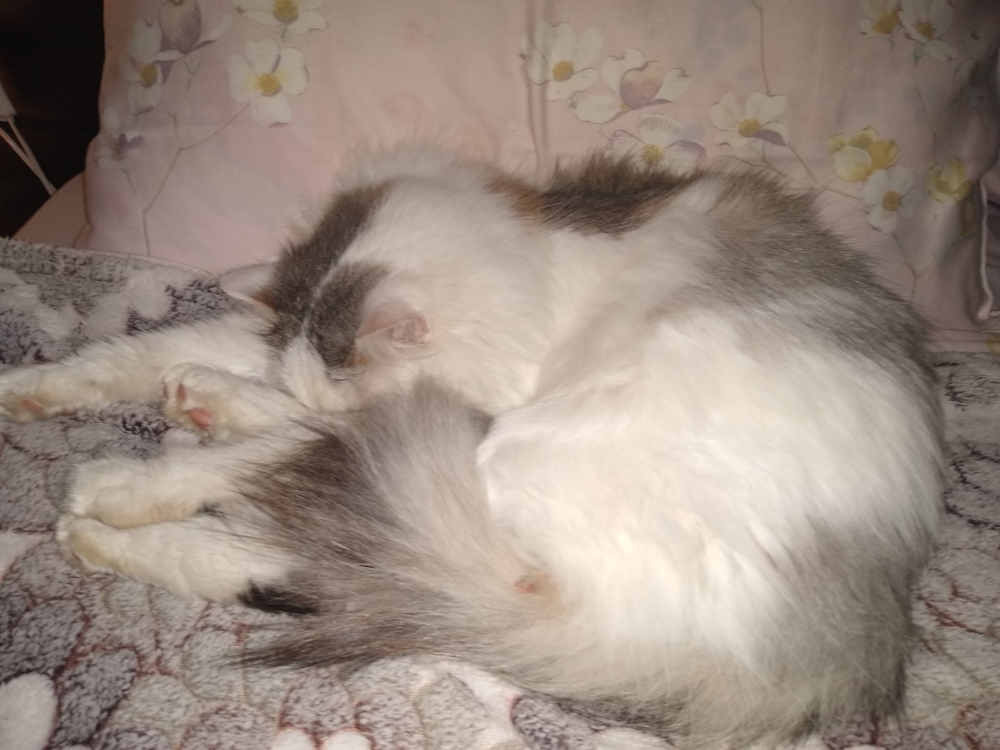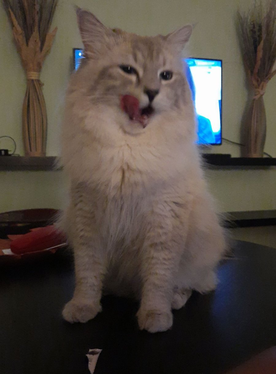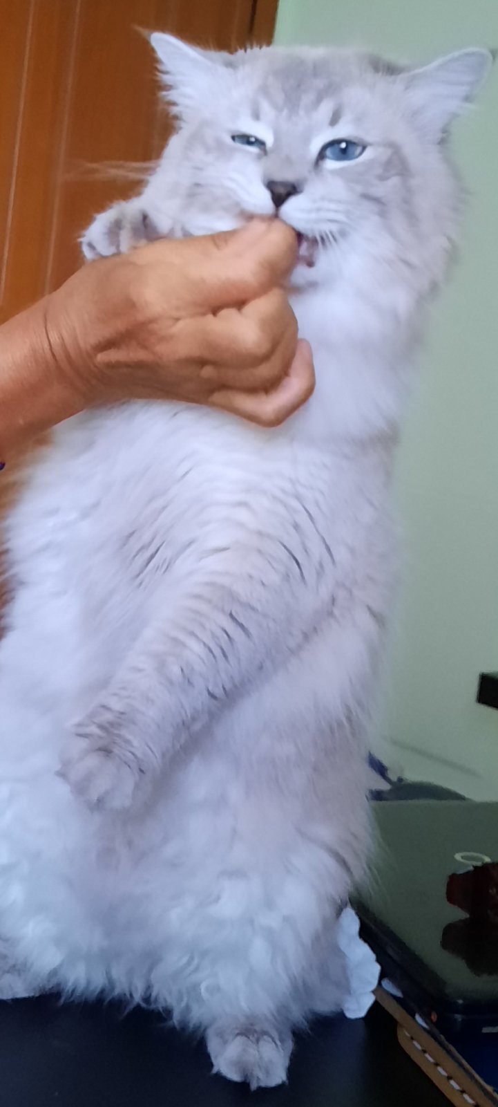 Нашия ритуал е вечер,  качва се пред мен и си проси лакомството "котешко шпекче"  пристрастен е към тях.