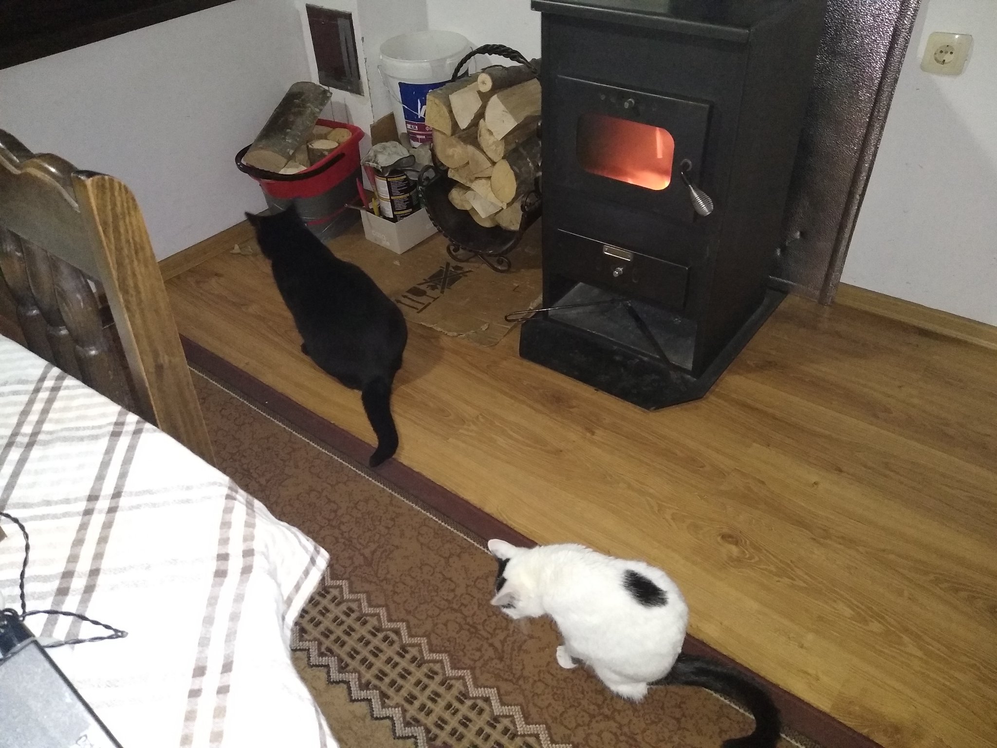 Двамата с Чери, след вечеря мият лапички пред камината.
