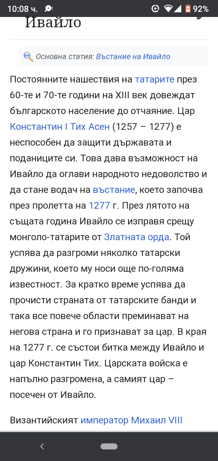 Аз пак казвам ако Ивайло е достоен цар и войн и човек за пример защо няма втори такъв? Фалшивите ивайловци са точно такива като него жадни за власт, склонни да правят машинации хора. Ако искаш да си полезен на владетеля си не го посичаш и взимаш власта му на сила. Убивайки царя си той е предател и точка.
