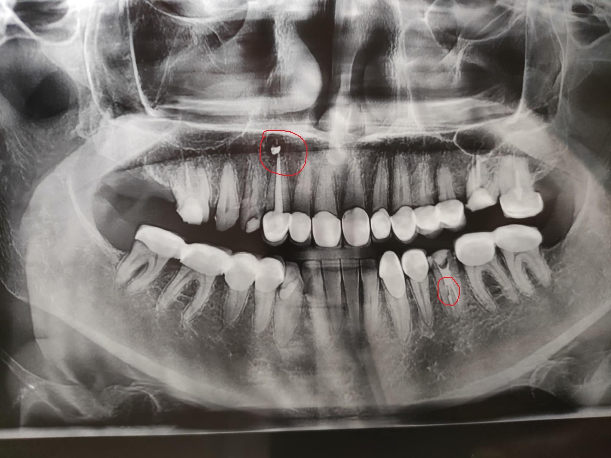 Днес ми запълниха канала на лекуван зъб и отидох за снимка до рентгена и като се върнах докторът беше взел по спешност да оперира ретиниран мъдрец. Операцията на пациента се забави и трябваше да тръгвам за работа и не изчаках. Следващият ми час е другата седмица. Прикачам снимка и съм отбелязала нещата, които ме притесняват-защо на горния кучешки зъб има бяла топчица над канала и на долния зъб, който съшо съм оградила, ми се струва , че имам счупен корен или някакво прекъсване в корена. Много съм притеснена, защото съм опатила от зъби. Ще съм благодарна, ако ми се даде и малка насока, поне да зная какво адекватно да попитам зъболекаря си  следващия път. Освен това усещам болка при дъвчене и неразположение. Имам и лека температура. Благодаря предварително.