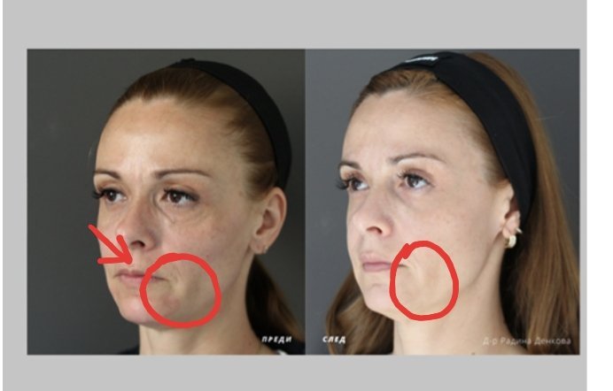 Но повече не може да слага нищо около устата, защото ще натежи и увисне.  Препоръча ми нещо, което се слага в края на скулите, не дава обем, но подновява колагена и дръпва кожата натам. Вижда се ефекта  4-5 седмици след като се сложи.