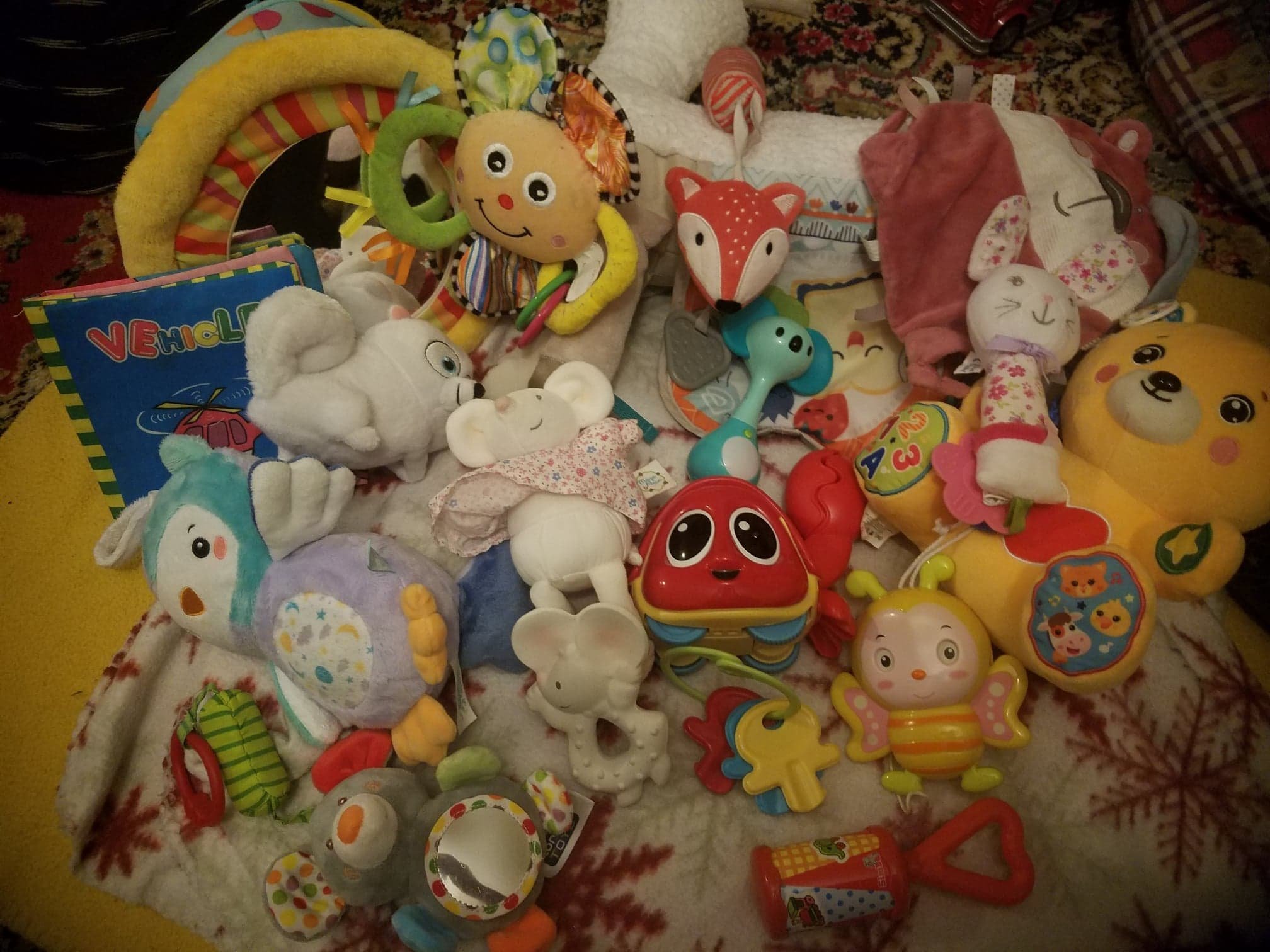 Има си играчки за шезлонг, за по корем, за количка, за дъвкане. Като знам какво иска да прави и давам съответната играчка. Най-се радва на най-обикновените, пластмасовите. Всички пластмасови са подаръци, повечето още от баткото.....ама пусто като се харесват.....