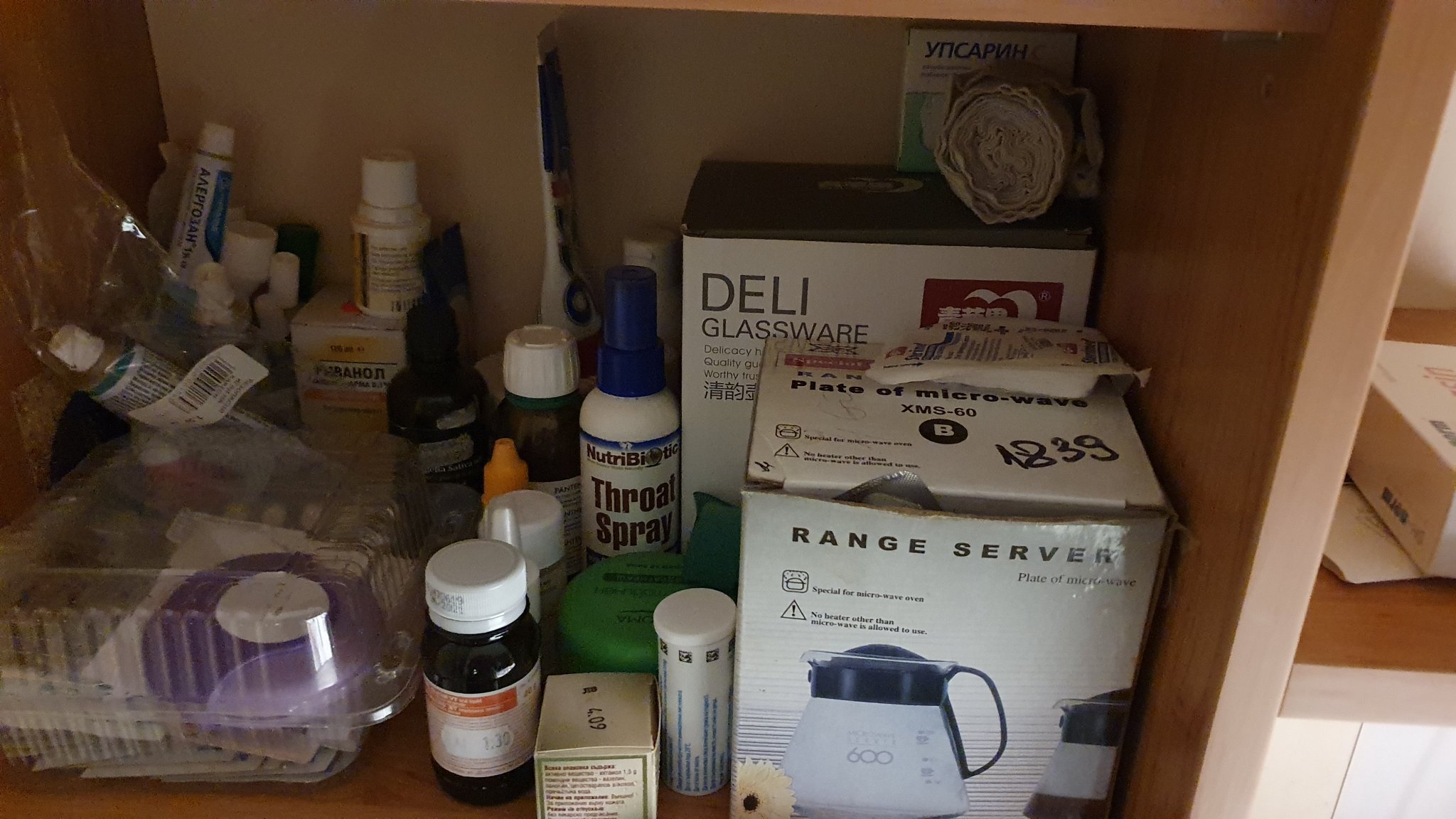 Обезболяващи разни в блистери са в картонени кутии, в друг шкаф.
