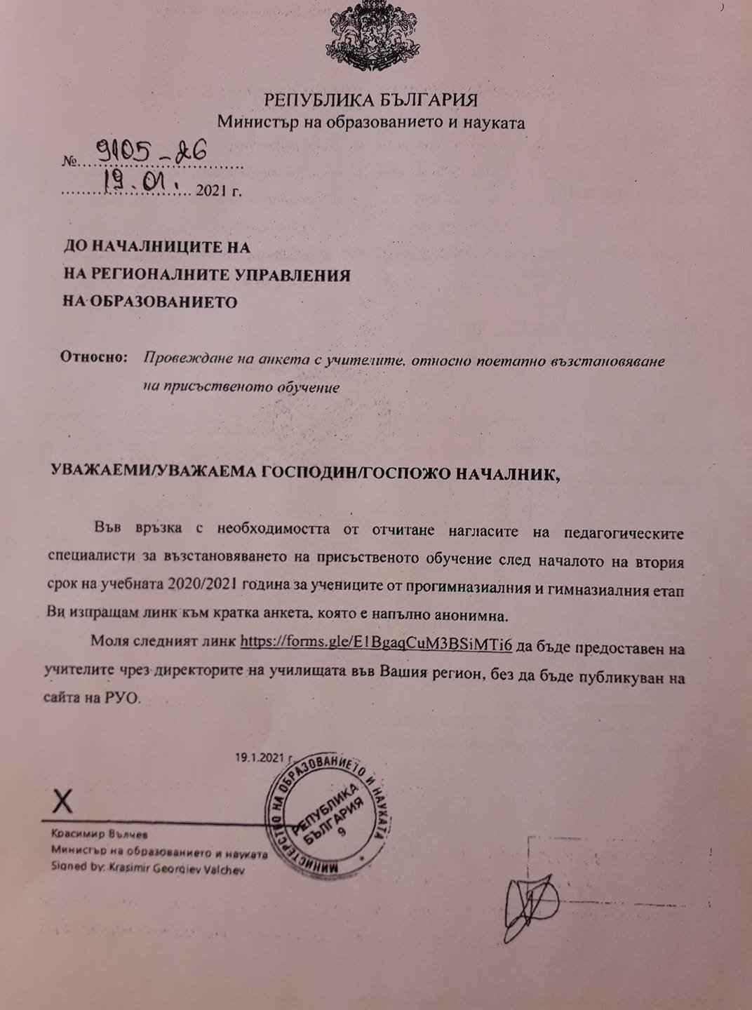 А вие получихте ли анкета за проучване за нагласите на учителите. При нас имаше от РУО: https://forms.gle/E1BgaqCuM3BSiMTi6