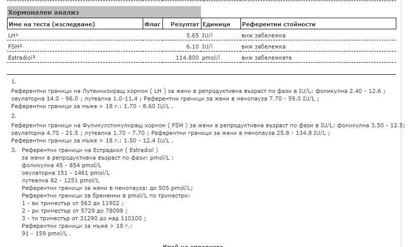 Може ли моля те коментар на изследванията ми? fSH, LH и E2 са изследвани на 3 ден от МЦ, а останалите на чист ден (10ти ден).