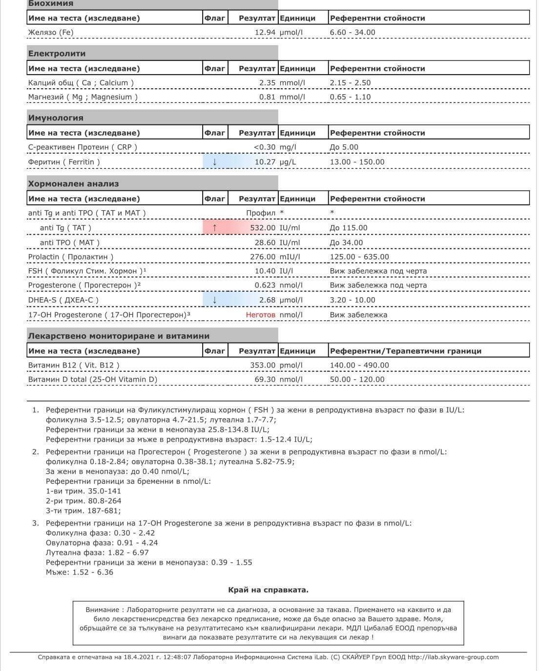 Здравейте, това са новите ми изследвания Simple Smile От 3 ден на МЦ, след няколко дни съм на репродокривен лекар, при ендолриноложката съм след седмица. Преди 6 месеца нямах проблем в изследванията, ТСХ ми беше 2.2 Simple Smile Може ли малко помощ? БЛАГОДАРЯ Simple Smile