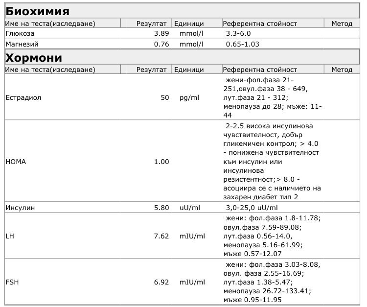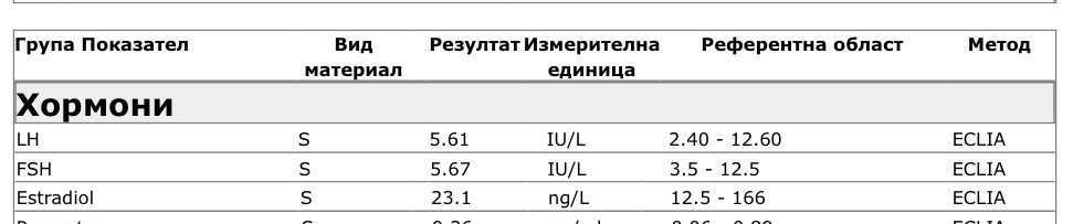Здравейте! Ще помоля за мнение на резултатите направени вчера (3-ти ден от МЦ). Пуснах ги на своя глава за проверка, защото преди 2 месеца ЛХ и ФСХ не бяха в съотношение (тях тогава пусках заради закъснение на цикъла два месеца с по 10 дни, от тогава насам е на 28 дни). После се оказа, че имам и лека ИР.