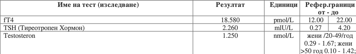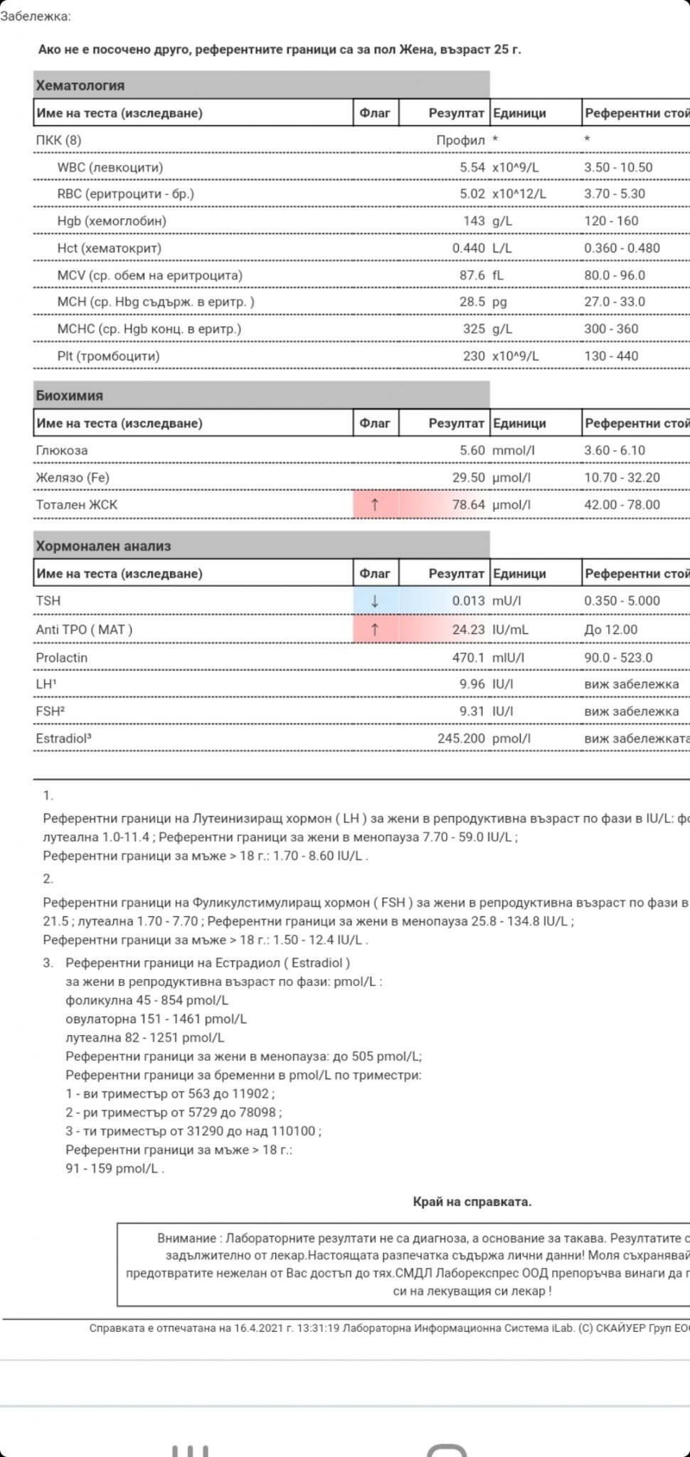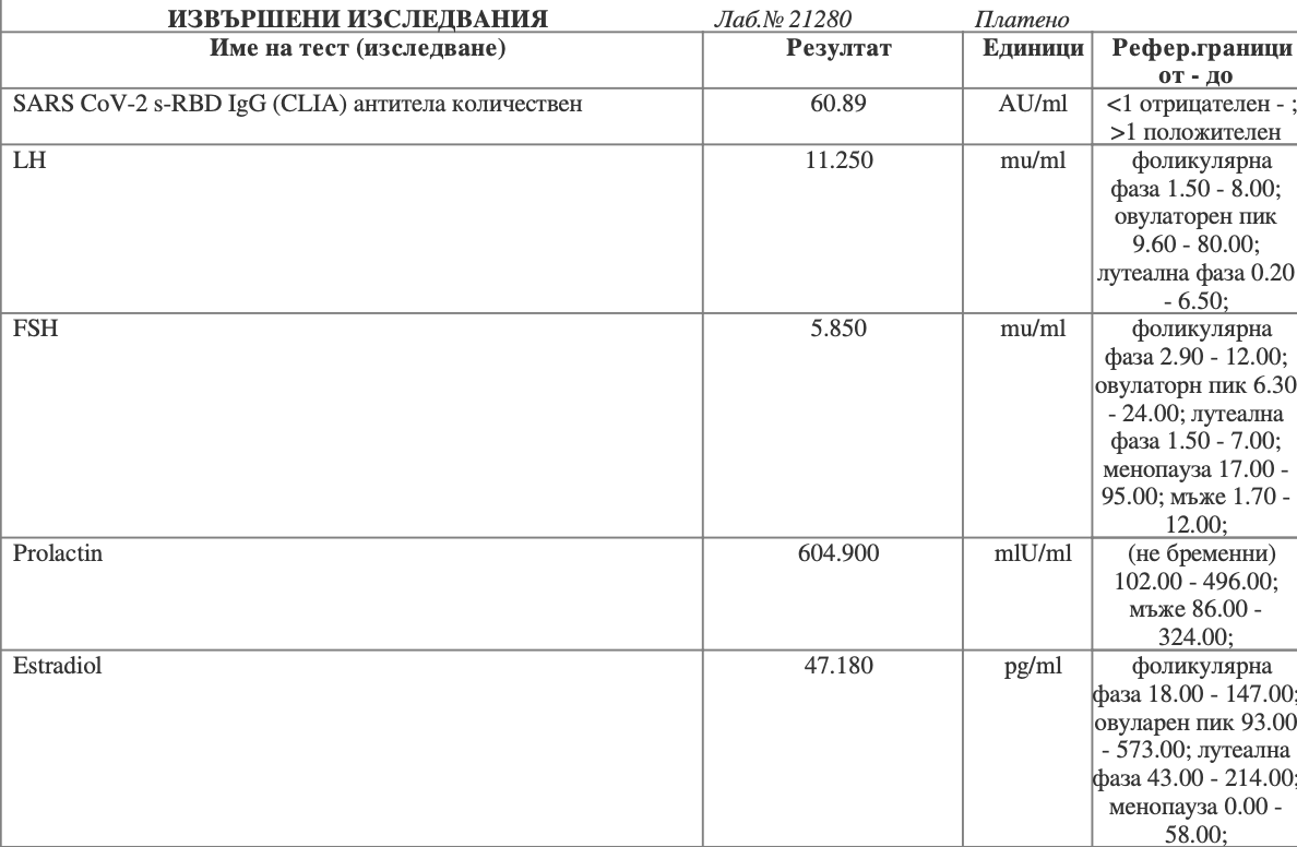 Здравей, Денис! Бях питала за хормонални изследвания, които да направя при прекомерно изпотяване. Консултирах се с лекар - ендокринолог и ми назначи изследвания, които направих днес (3-ти ден от МЦ). Бих искала да помоля за помощ при разчитането тъй като имам час при лекаря чак за края на другата седмица. Единственото, което аз забелязах е, че пролактина е висок. (на 23 години съм)