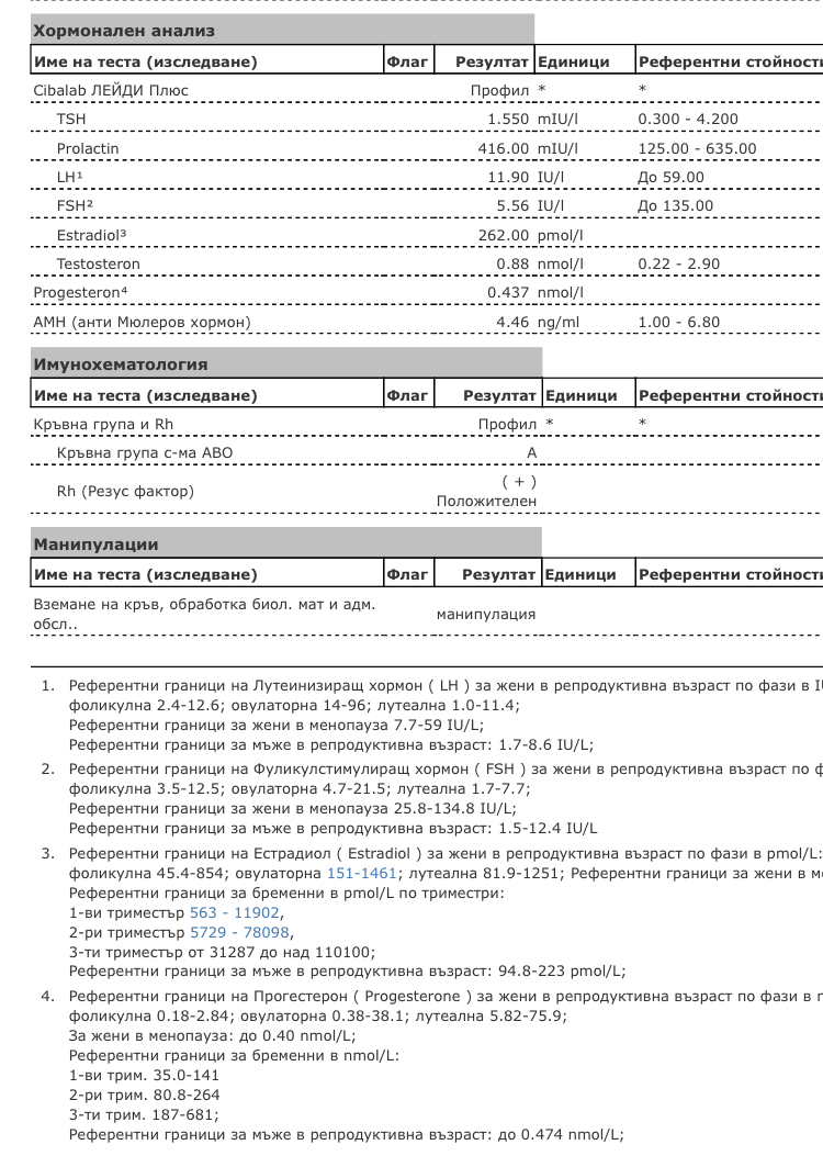 Репродуктивния специалист ми назначи следните изследвания на 3 ден от МЦ. Изненадах се от високия АМХ. На прегледа при док, тя видя по 15 антрални фоликула във всеки яйчник и каза че всичко изглежда наред. Видя и жълто тяло, и потвърди че съм имала О. Преди 2 месеца бях при обикновено АГ, където също проследихме О. От 10 месеца правим опити, ползвам и лентички за О + мерене на БТ, и всеки месец БТ се вдига, а само през 1 от месеците имах повече от 1 положителен тест за О. Доколкото разбирам АМХ > 4 е признак за СПКЯ, съответно липса на О. Много ще съм благодарна за мнение от по-опитните в темата.