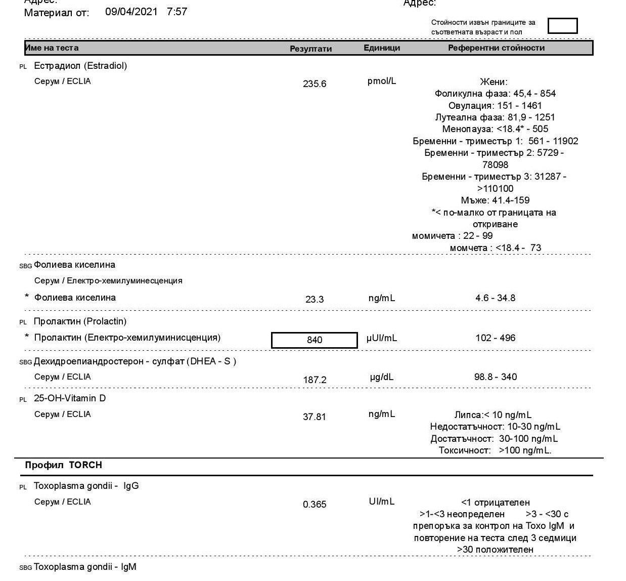 Тези са от април месец, след което започнах терапия с Достинекс поради открит микроаденом на хипофизата. На контролата  след 1 месец обаче пролактина отново е завишен. Дали е възможно разликата да идва от там, че април месец го изследвах на 3-ти ден от МЦ, а на контролата беше в чист ден?
