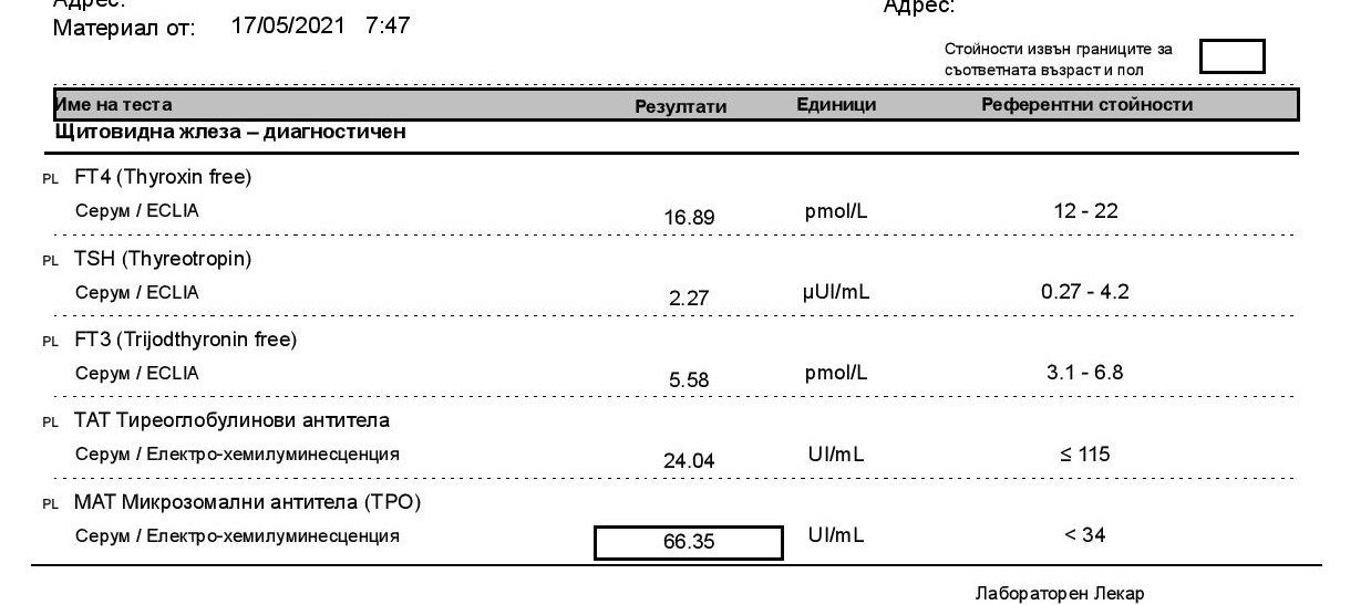 През февруари, когато прегледаха щитовидната, пуснах и трите - стойностите от тогава са: TSH - 1.53, FT4 - 18.4, FT3 - 5.11. Тогава Денис ги погледа и каза, че са ОК.
