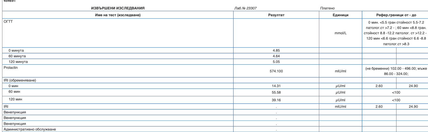 Здравейте! Искам да помоля за помощ при разчитане на тези резултати за ИР и пролактин. Направени са на 4 ден от МЦ. Пролактина виждам, че е висок, но от останалите стойности нищо не разбирам. Изследването ми беше назначено след като при предни изследвания се установи, че имам СПКЯ. На 22 години съм.