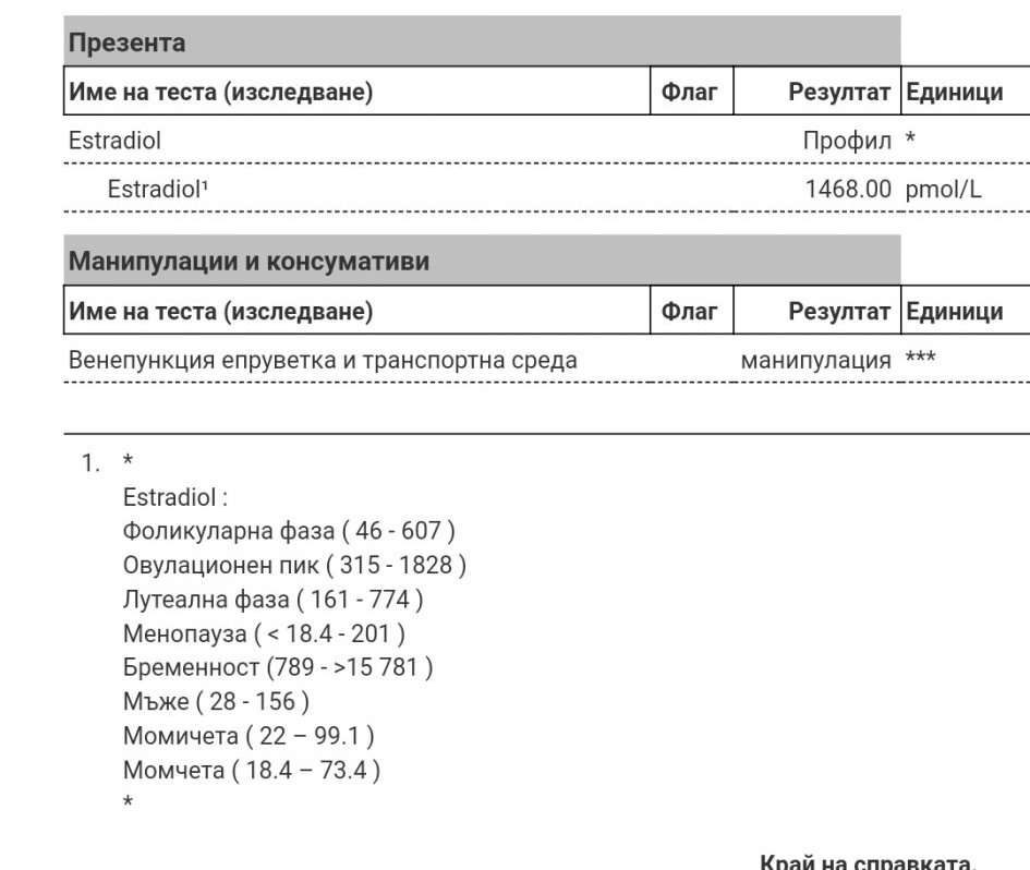 Излиза празно като не е готов резултата. Дори и референтните стойности за естрадиола са празни. Може да се обадиш в лаборатория да ги питаш какво става.