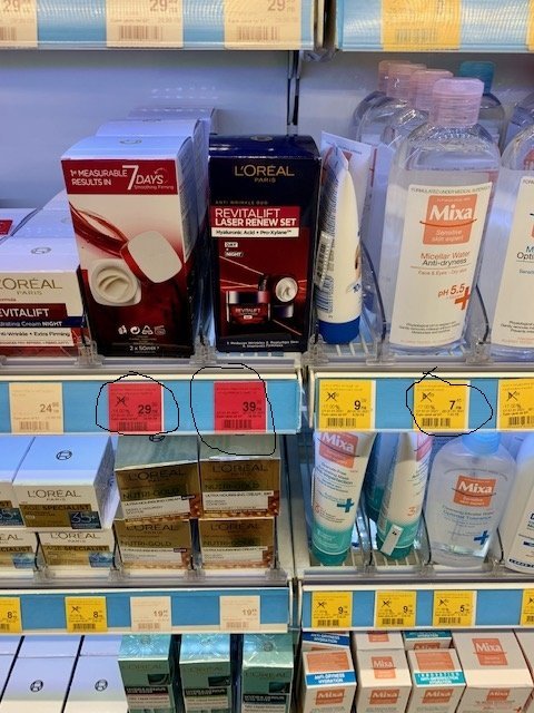Следя си при маркирането на касата. Няколко пъти ми се случва с червила и фдт, които са с цена на червен етикет, при маркирането да излизат на реална цена. Оказва се, че на някои от етикетите с малки букви пише за кой цвят или номер се отнася промоцията. Друг път път точно на тези червени етикети пише цвета на продукта за който важат, аз вземам същия продукт, но друг цвят и на касата се изненадвам като ми го маркират с промоционална цена. Наистина не разбирам логиката на етикетите с промоциите им, да не говорим, че половината продукти от брошурата са без сменен етикет в магазините.