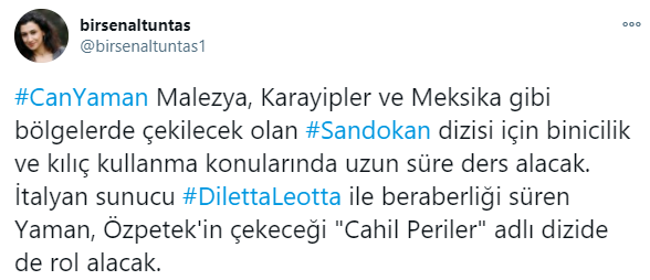 Can Yaman ще отнеме много време за уроци по конна езда и използване на мечове за драмата Сандокан, която ще бъде заснета в региони като Малайзия, Карибите и Мексико. Яман, който е заедно с италианската водеща Diletta Leotta, ще участва и в телевизионния сериал "Cahil Periler"/ "Невежите феи", заснет от Йозпетек.