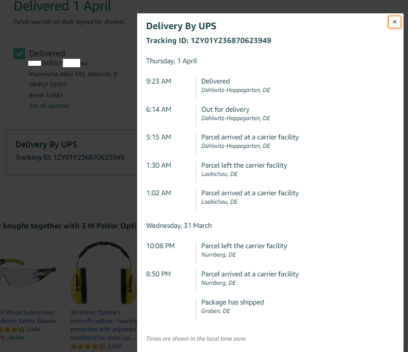 Този адрес не знам къде го видяха?! DELIVERED,BERLIN,12689, след като поисках подробен тракинг от УПС на пощата си преди малко: