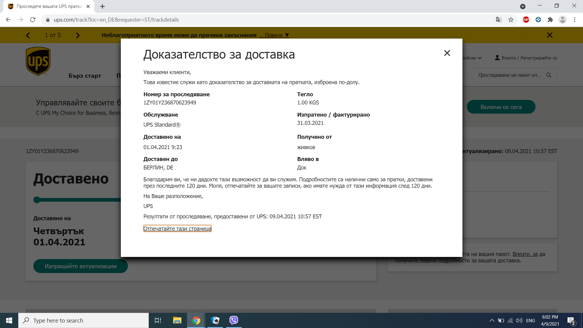 Как мога да проверя дали моята пратка от Германия с Габиели е доставена?
