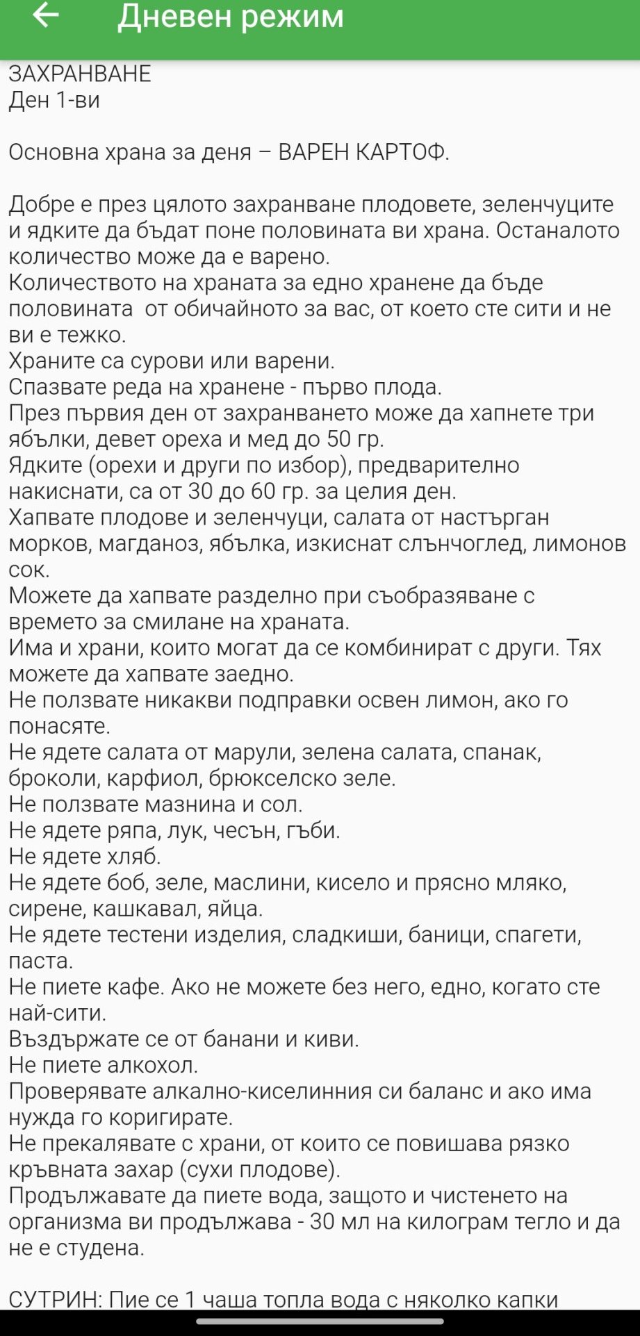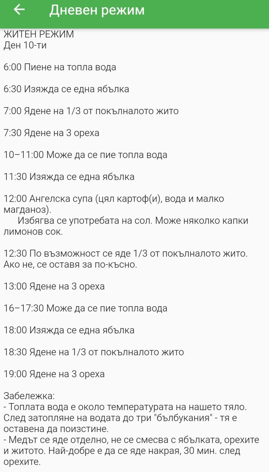 За да започнете житния режим, се препоръчва предварително покълване на житото или лимеца. Важно е да следвате часовете за хранене въз основа на използването на тези зърна. Участниците също така подчертават важността на избягването на месо, млечни продукти, брашно и силни чайове (освен в изключителни случаи). Препоръчително е да се консумира преварена изворна вода и да се избягват непозволени чайове.