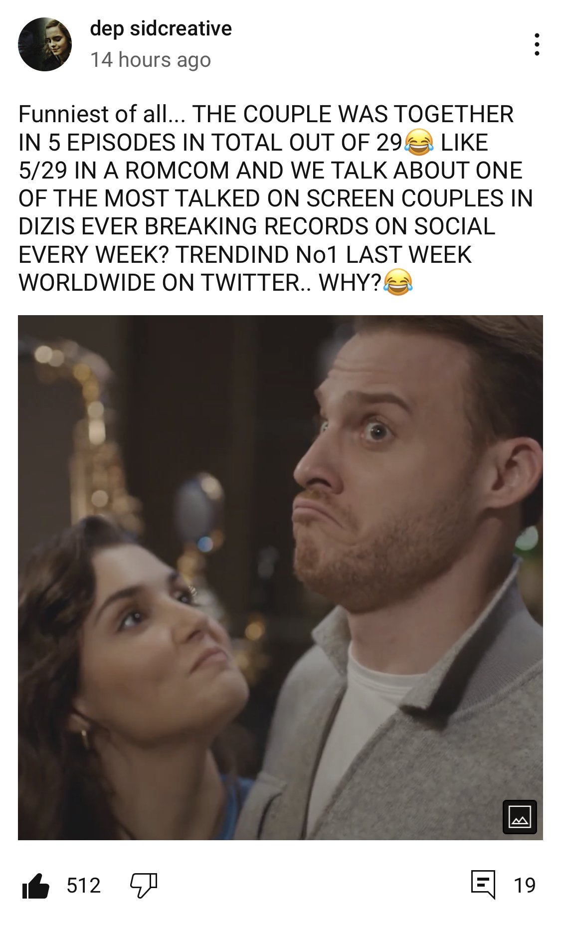 Превод в резюме: “Най-забавното от всичко е, че двойката са били заедно в 5 от 29 епизода, а сме ромком и това е една от най-обсъжданите дизи двойки за всички времена - номер едно в социалните медии всяка седмица и световен тренд миналата седмица в Туитър.”