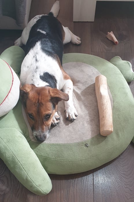 Аз също искам да кастрираме нашия Арес, но мм и синът ми са категорично против. Някаква мъжка солидарност. Със сигурност няма да го размножаваме, та поне със съвестта нямаме проблем. Иначе аз си купих от китайците имитация на фурминатора - върши ми страхотна работа, когато се сетя да го ползвам.  Дойде ми от Зооплюс кафееното дърво. Малчо доста се забавлява, нищо че изглежда колкото него. И няколко естествени кокали взех, та е супер доволен. Ето тук как се е излегнал, изтощен от борбата: