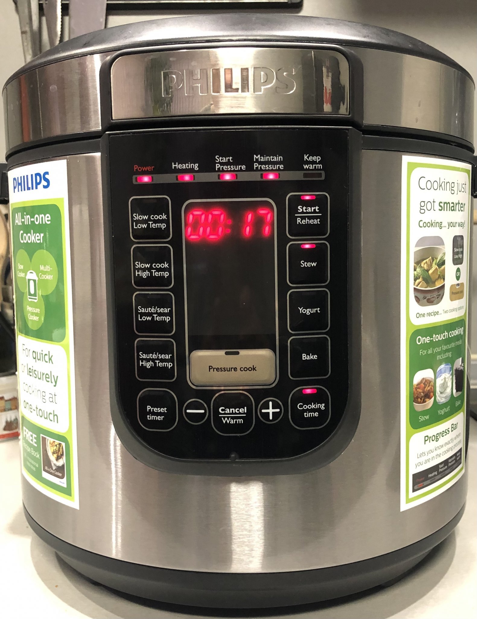Вчера мих целият капак. Днес реших да го разглобя, нямаше остатъци от храна, и пак сглобих. Май не съм на целила мястото на частите на клапана, но това ще го оправя. Варих макарони. Успях. Обаче не съм сигурна, че бях на точната програма. Освен това не открих как да настроя времето за по-малко от 20 минути. Възможно ли е да не може? Изядох инструкциите, но са много постни. В книжката с рецепти има само някакви изгъзици, извинете, не стига, че са на английски. Пфу. Щракнах кукъра някой ако може да помогне.