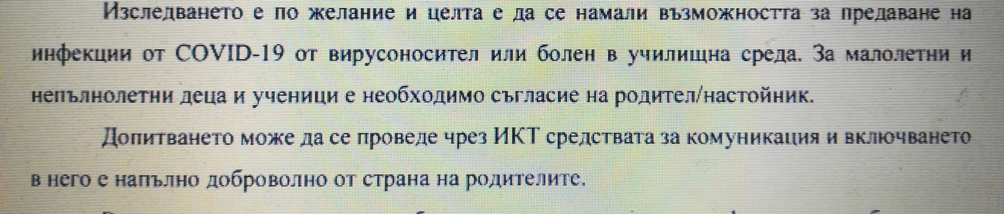 Селесте, анкетата беше от 2 въпроса: 1- родител на дете от кой клас съм и 2- дали съм съгласна детето да бъде тествано с бърз антигенен тест. Анкетата била с цел проучване на нагласите на родителите.
