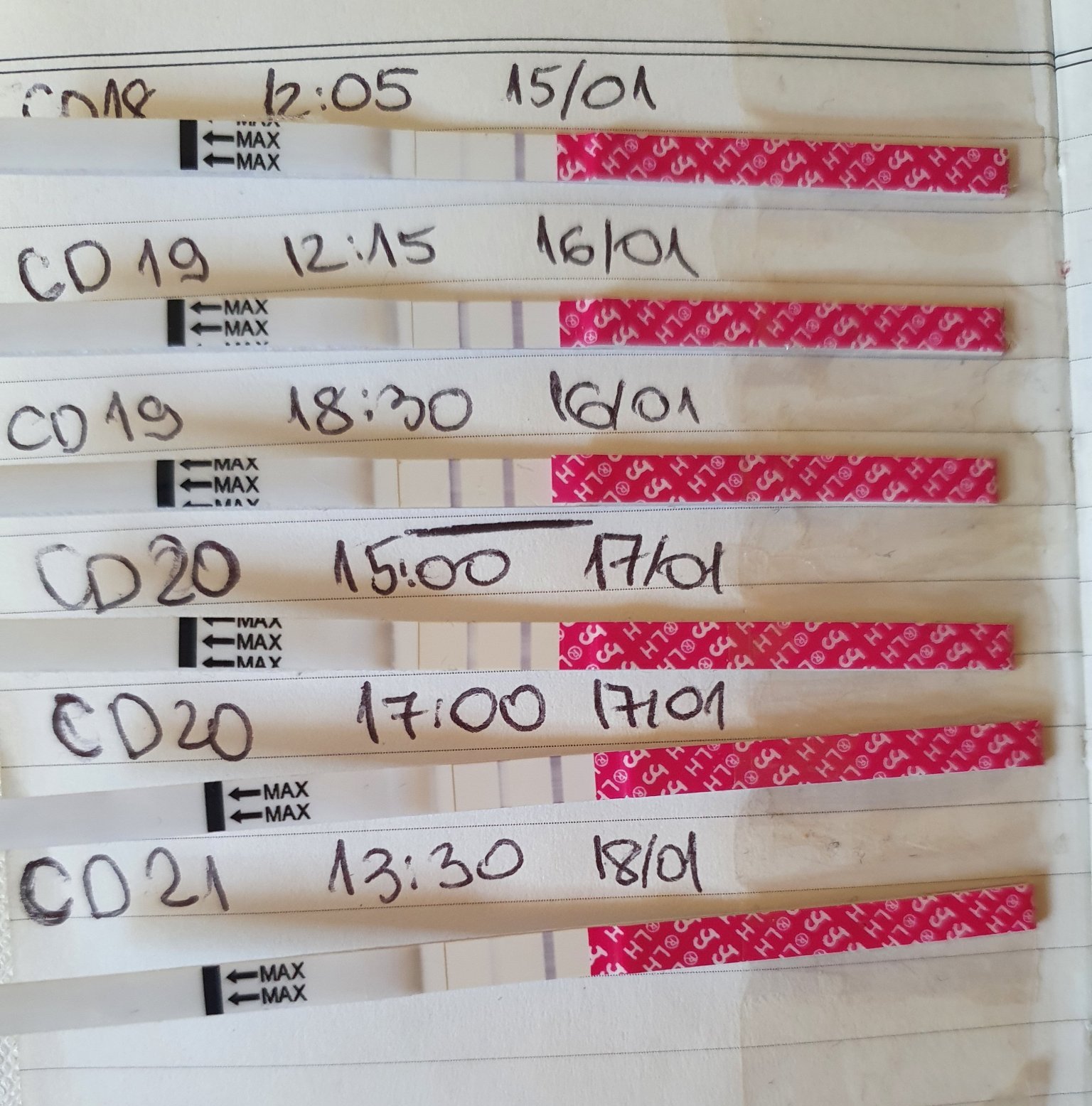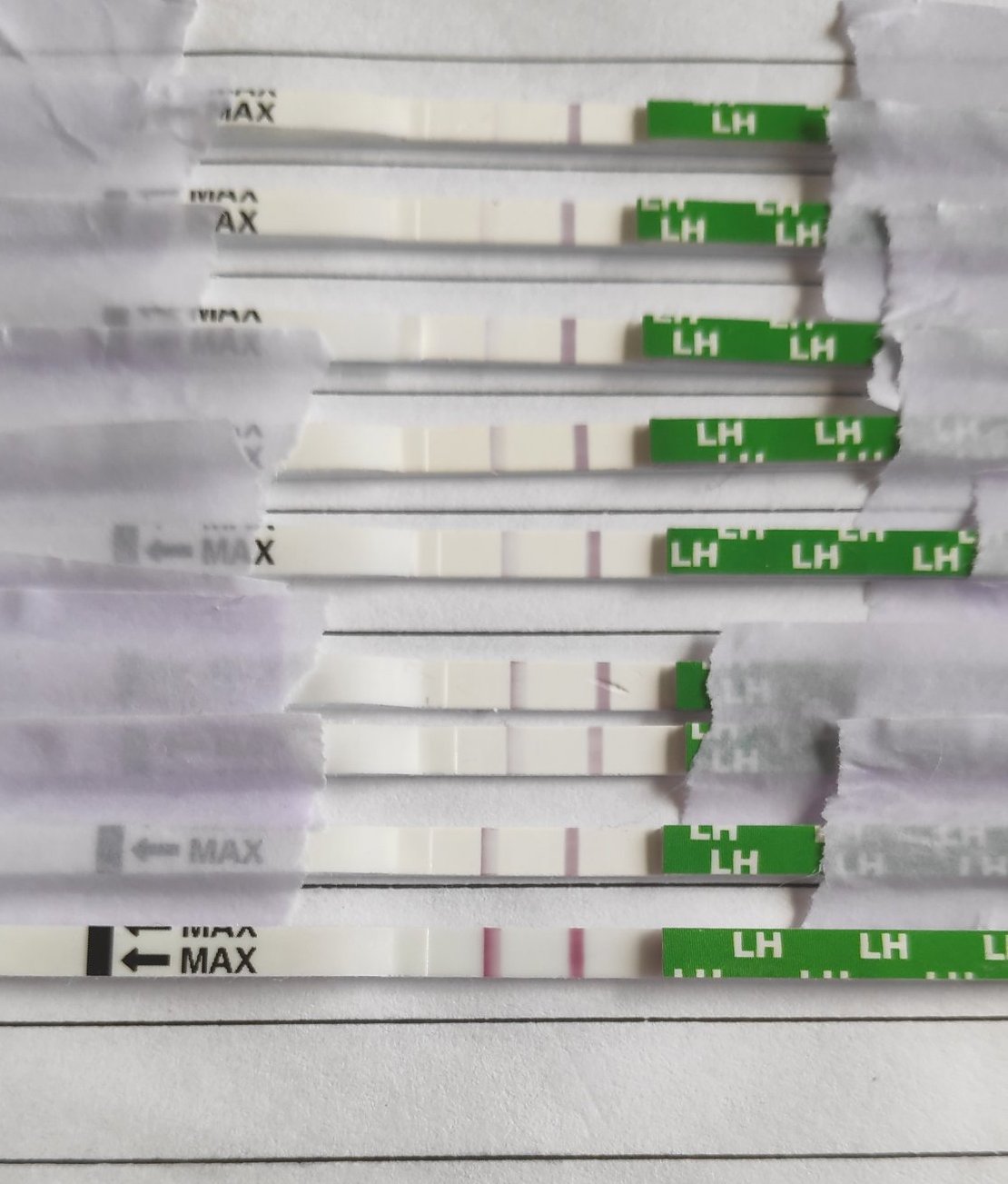 Беше 29 дни преди, февруари имах биохимична бременност , след което ми дойде чак на 35 ден, така че сега наистина не мога да изчисля кога ще е, затова реших освен фоликулометрията да правя и тестове за ОВУ. Първите ги правих в 19:30ч. , сега започнах към 16:00 да ги правя.
