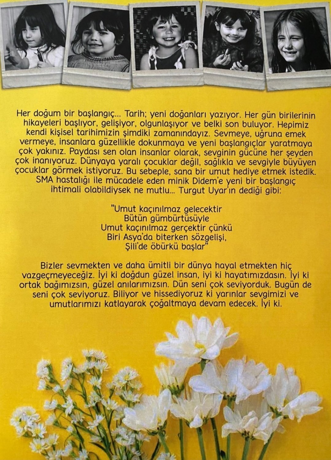 По тази причина искахме да ти подарим надежда. Както казва Тургут Уяр: “колко сме щастливи, че можем да подарим ново начало и надежда” на малката Дидем,  борещата се със СМА.