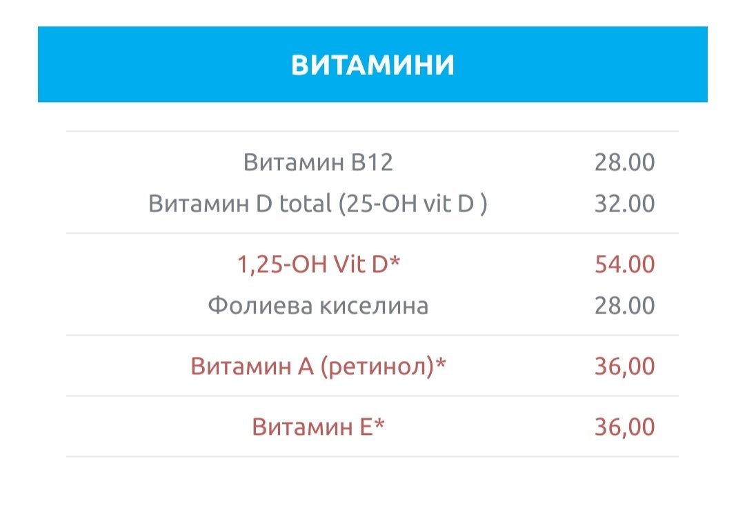 Бодимед изследват витамини А и Е - по - точно взимат кръв и я изпращат в лаборатория в Германия. Цени на сайта си мисля нямат, но на място дават информация. Не съм се интересувала скоро и не мога да кажа цени.