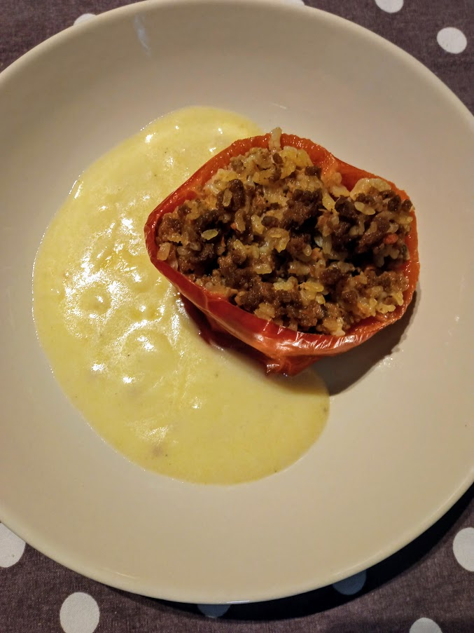 Реших да направя опалянки, но установих, че миксерът ми е в София. Пробвах да разбия белтъците на сняг с пасатора (бях убедена, че няма да стане 😜)... Нямах и крема сирене и сложих извара. За да се сгъсти сместа добавих настъргана моцарела, малко ленено брашно,  което намерих в един буркан и 2-3 лъжици кокосово.