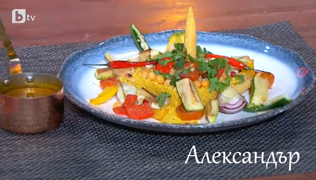 Много му е зле чинията на Алекс.. Наистина са парчоци и то сурови. Четвърт глава лук, половин тиквичка, цяла бейби царевица и нахутът не прилича да е поне малко намачкан или сготвен добре. Не знам какво му харесаха на това. Пламена поне сготви нещата, въпреки соса и орехите. Да не говорим, че ако не го бяха видяли тоя кутайски сос, едва ли щяха да разберат, че е вътре. 🙄