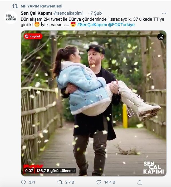 Никога не съм споделяла чувствата си относно телевизионен сериал в Tуитър преди SÇK. Ето защо сериалът винаги ще има специално място в сърцето ми, защото открих съвсем нов вид взаимодействие и семейството на SÇK. Ние сме тук от самото начало и ще бъдем тук до края. Желая ви прекрасен ден, където и да сте по света, с любов от Истанбул. Среща в събота вечер, за да обсъждаме любимото си дизи. Simple Smile
