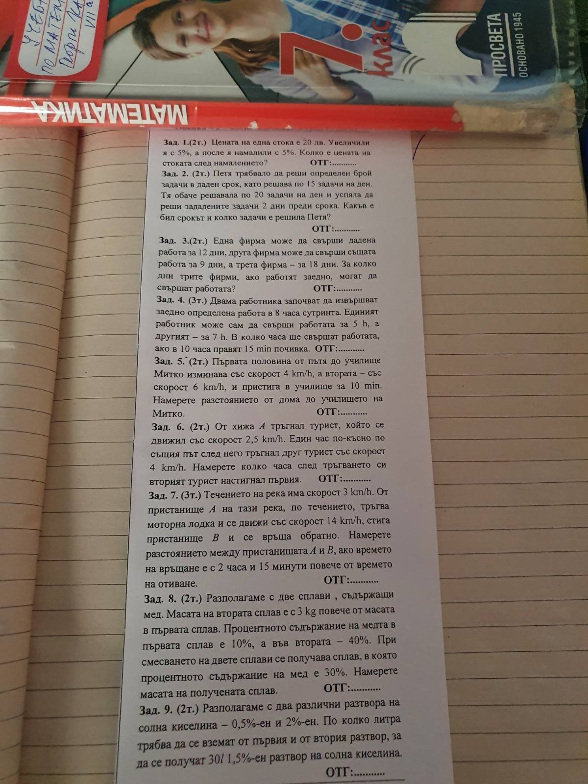 Здравейте, имам нужда от помощ. Моят седмокласник закъса с някои задачи от движение, работа и др. такива.Може ли да помогнете? Като ги имаме решени ще можем да решаваме и други подобни. 1,2 и 3 задача ги реши, но искам да видя дали са му верни.