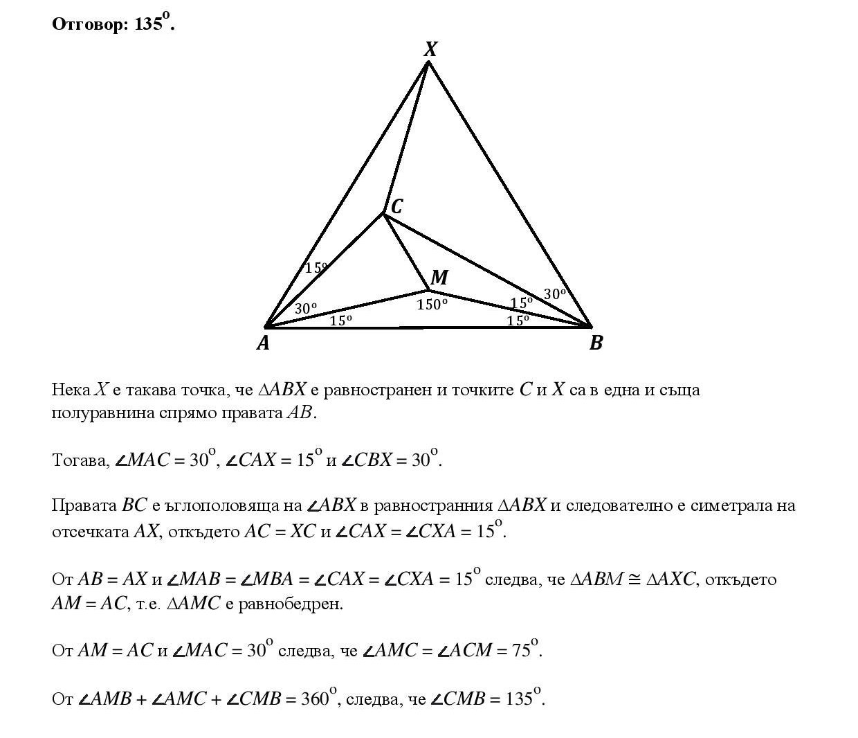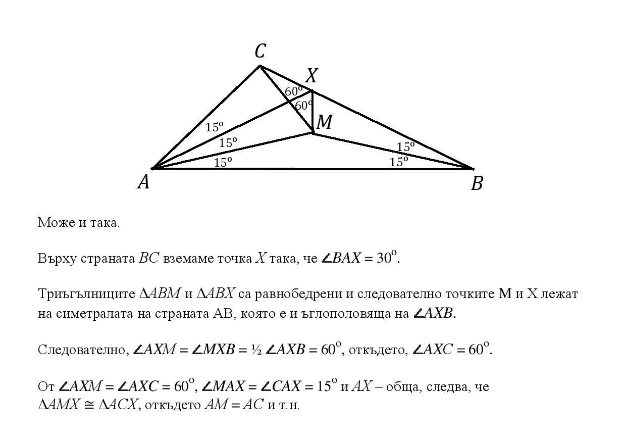Даден е триъгълник АВС с ъгъл ВАС=45 и ъгъл АВС=30. Точка М е вътрешна за тр-к АВС и ъгъл МАВ= ъгъл МВА=15.