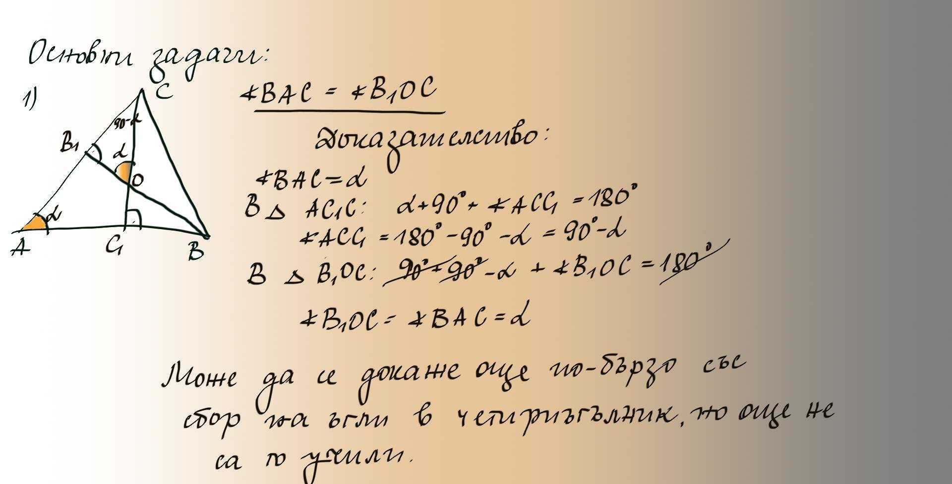 Ето, Кристина, доказателствата на две основни задачи - тази за острия ъгъл между две височини в остроъгълен триъгълник и тази за тъпия ъгъл между две ъглополовящи на вътрешни ъгли на триъгълника. Има и още основни задачи  - довечера , ако имам време , ще напиша и тях. Целта им е пестене на време в  първата част на изпита. Във втората се доказват.