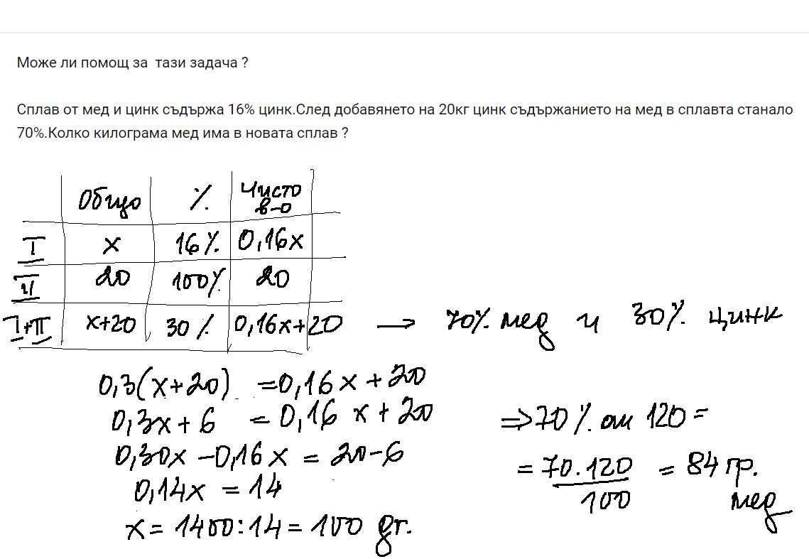 Медта в първата сплав е 84% от общото тегло х, а във втората е 70% от х+20. (в новата и в първоначалната сплав теглото на медта е едно и също, не е добавяна мед, а само цинк)