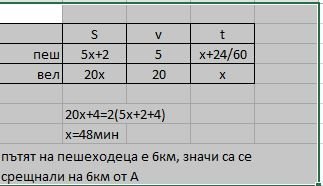 В условието не виждам пешеходец. Вероятно грешка. После скоростта на велосипедиста по условие е 15 км, а не 20,което фигурира в таблицата. Нататък не съм гледала.
