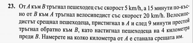 Ами да. Динчо е права. Велосипедист настига пешеходеца на 6 км., но го среща на 3.Т.е.като тръгва от В го среща,а от А го настига.