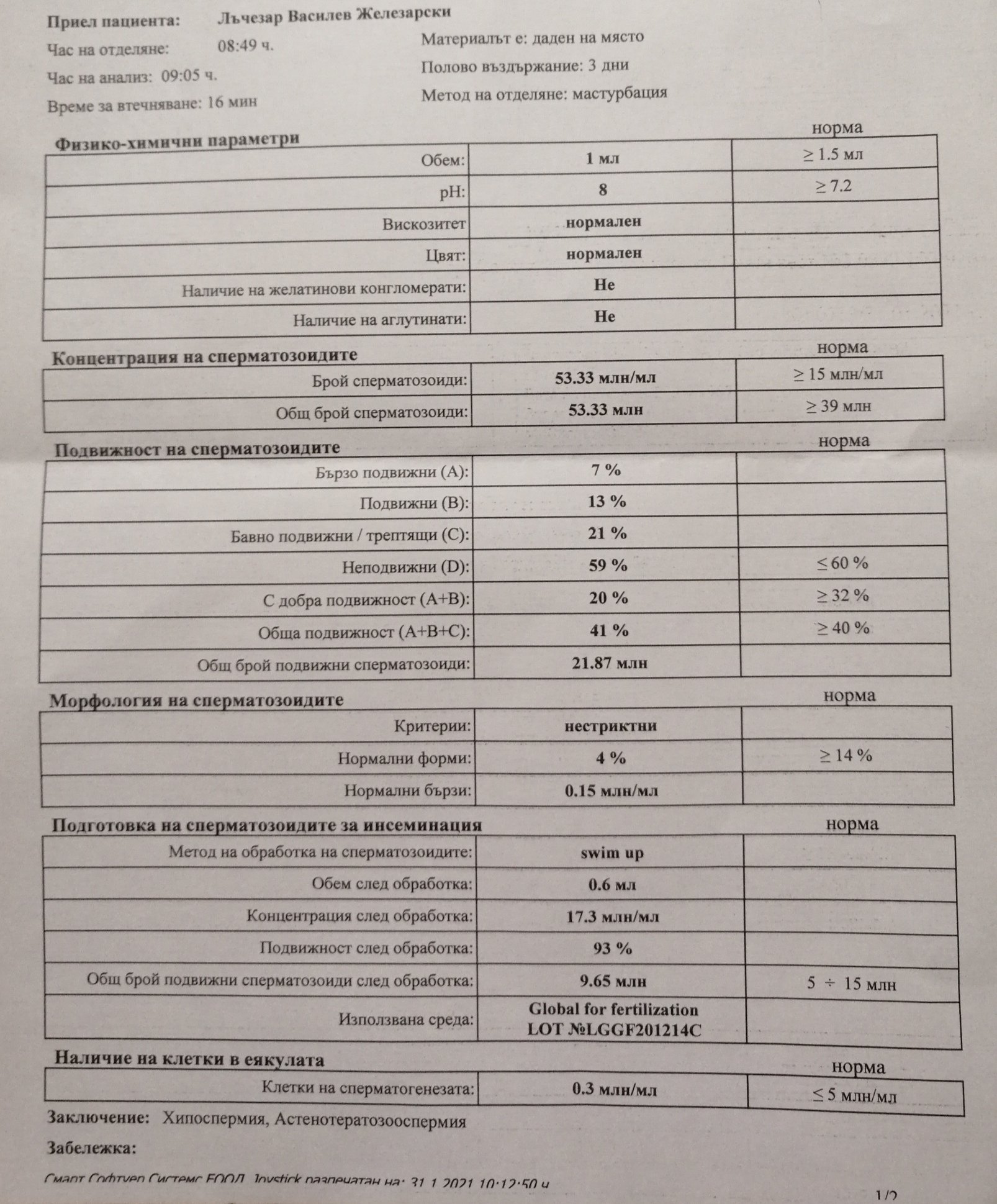 При вас и подвижност , и морфология са занижени. Може да направите още една СГ след месец в друга клиника, заключение от уролог, а за теб АМХ , което е не по-старо от 6 месеца - това са нужните документи. Моята приятелка, която от първо ин витро забременя, а преди това имаше и неуспешна инсе, ни посъветва още преди да идем на 1-ви преглед , ако сме с мъжки фактор да не се съгласяваме на инсе, а директно ин витро. Имам позната , забременяла от 2-ра инсе, но и при давамата няма открит сериозен проблем.