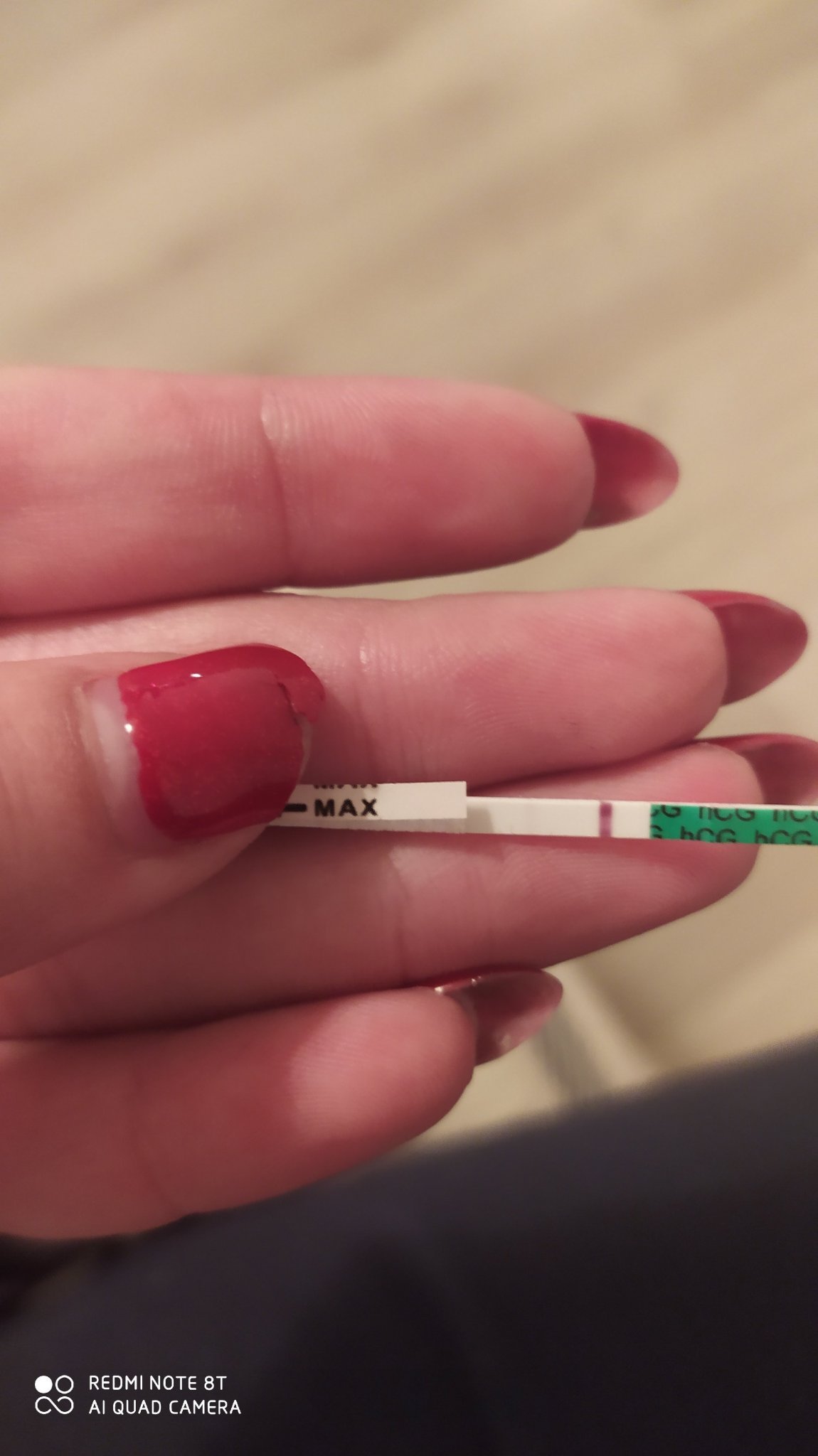 Момичета, още нямам М, 30 ден ми е днес и пак направих тест, но го направих вечерта. Струва ми се , че има много бледа черта, какво ще кажете? С телефона не ми се получи много добре снимката.