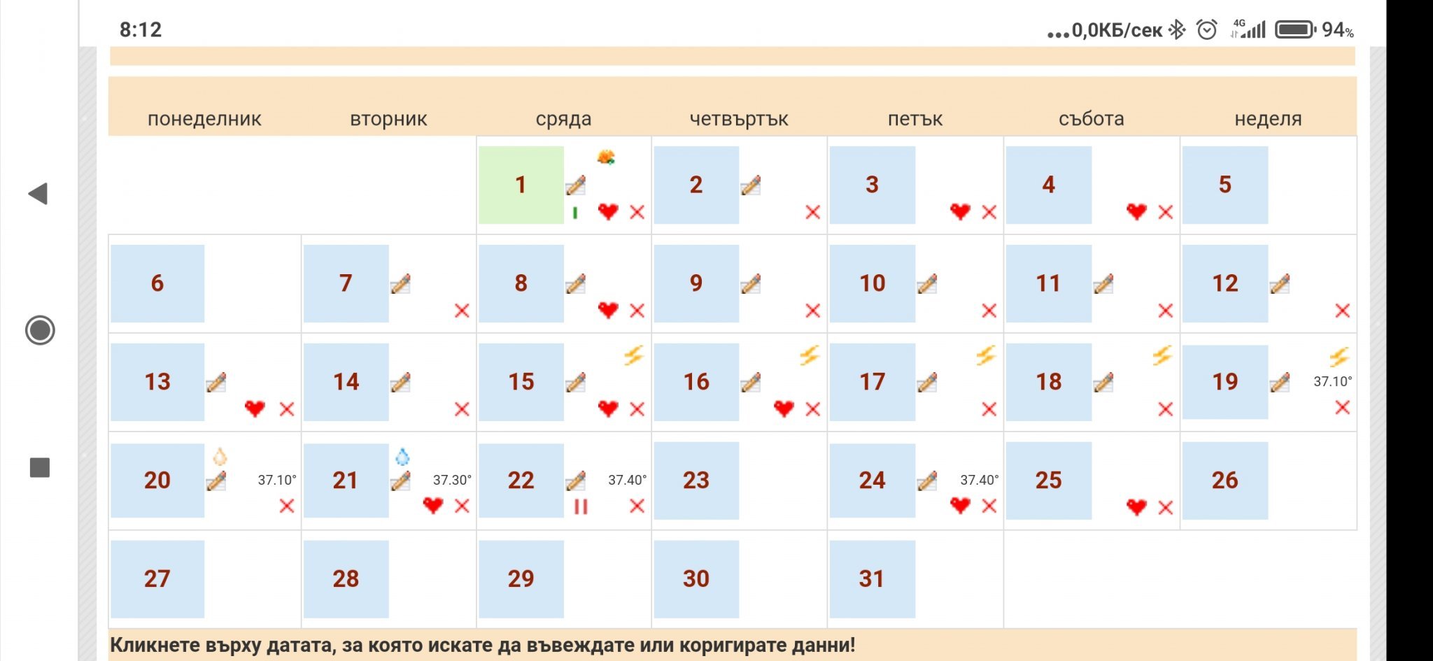 Ето ви пример и с моя календар при предишното ми забременяване. Вижда се тестовете за овулация кога са дали IIна първата снимка, а на втората е II за бременност. На първата може да видите, че съм била болна с температура този месец, но не сме отменили опитите.