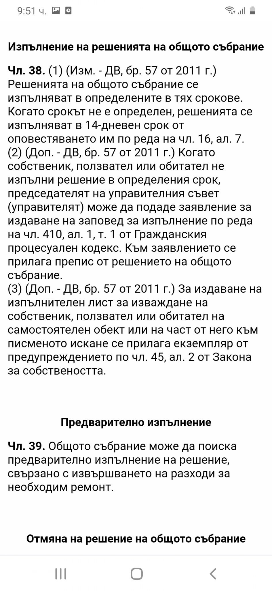Отпечатах ѝ съответните пасажи от закона и подчертах там съответно къде греши. Че присъствието ми на събранието не е задължително, но е задължително Събранието да е законно, и е задължително да ме информират за решенията на това Събрание в срок и както трябва. Е извини ми се. Е, аз знам как стоят нещата, но тези, които не са информирани, може да си ги лъжат както им скимне.