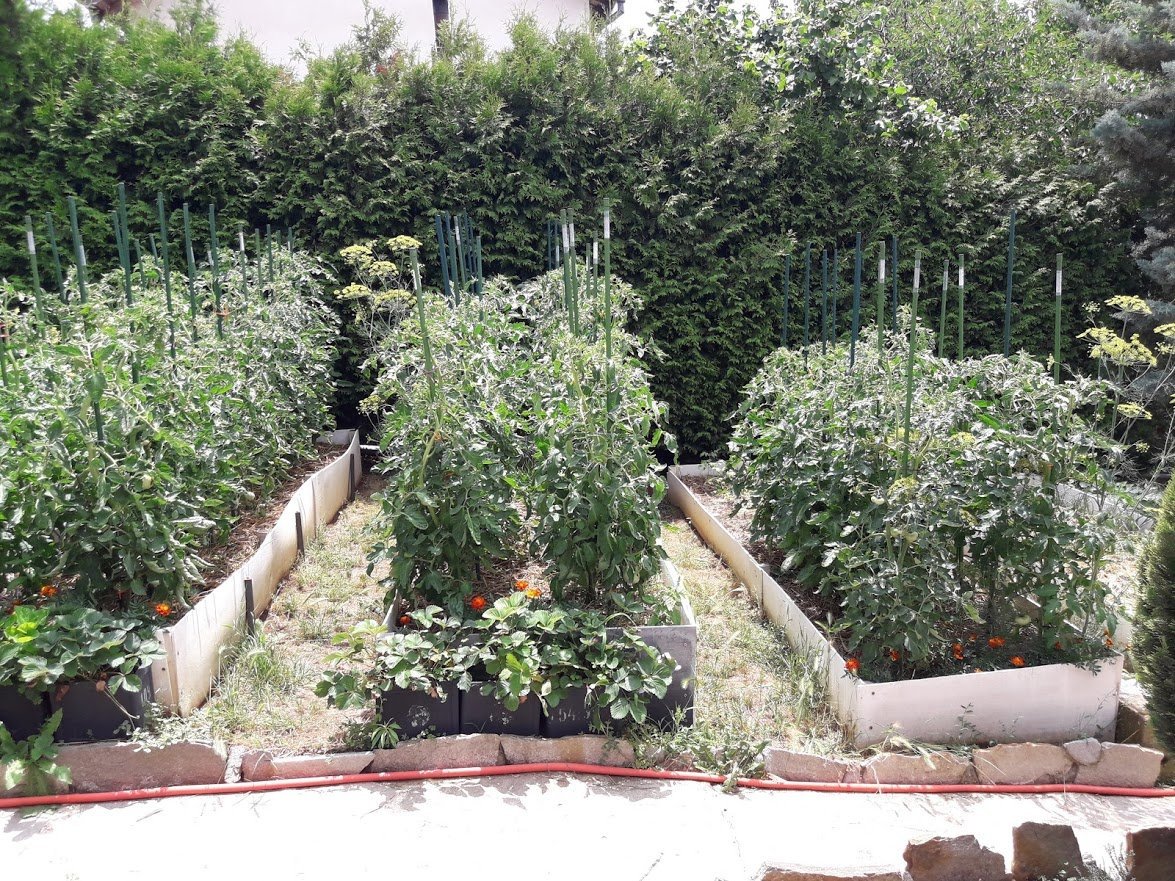 Насипахме 10 кубика хумус и в същия ден сложихме и тревата (адксия зор беше с греблата, ама пък даде резултат). ММ вече спретна поливна система и поне тестово сработи. Ето я, на 10 дни как изглежда; има нужда от дооправяне (старае се), ама като не слагаш чимове си е процес и не ставало от раз.