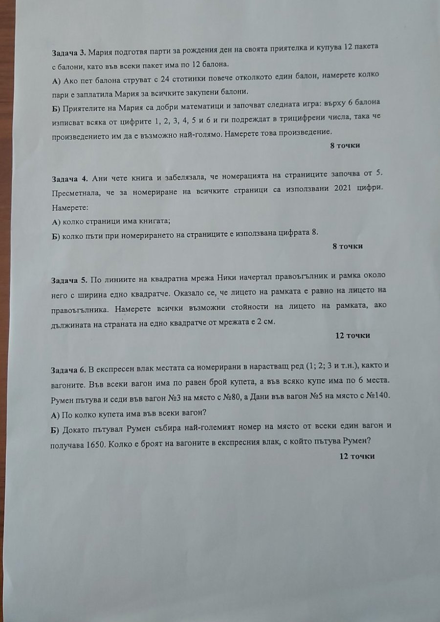 Ако 5 задача е тази с правоъгълника и рамката с равни лица, тя е затруднила и моето дете. За съжаление не може да си спомни пълното условие на задачата, за да я решим заедно.