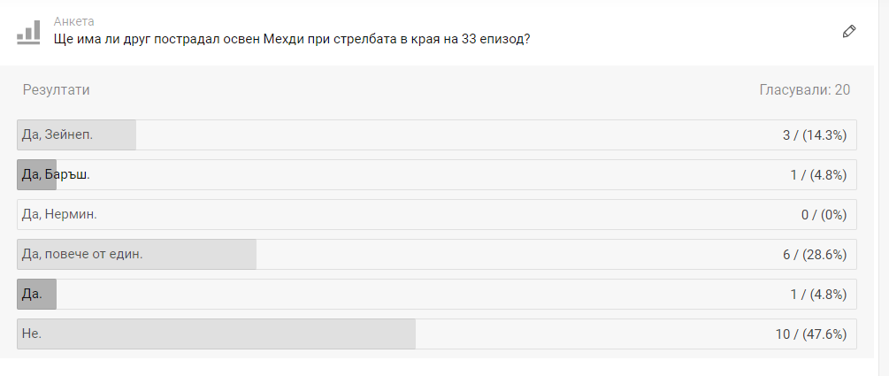 Безспорно имаме нужда от малко по-стегнато развитие по някои сюжетни линии. За Зейнеп сценаристите трябва да измислят най-накрая какво иска и да престанат да я люшкат между Баръш и Мехди. Според мен, след заключването на Бенал, страницата Мехди би трябва да е окончателно затворена, но много хора коментират, че предвид милозливата ѝ натура, като нищо точно Зейнеп ще се заеме със защитата на Бенал... нещо което от сега казвам, че изобщо не би ми допаднало, ако се случи.